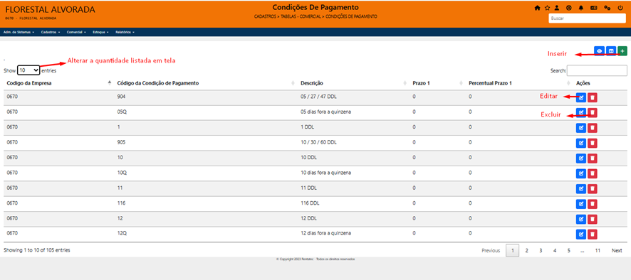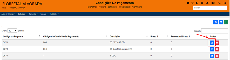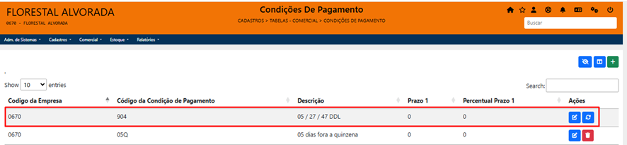 Sistema mostrará a tela abaixo com todas as condições de pagamento cadastradas e ativas.