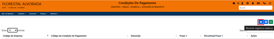 Para verificar se tem alguma condição de pagamento inativa, é só clicar no ícone