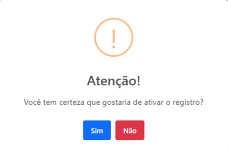 Clicando no ícone para reativar um registro, o sistema fará a confirmação abaixo.