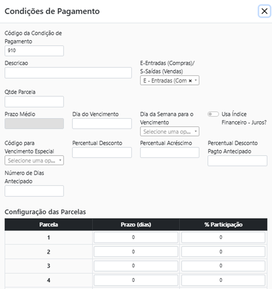 E-Entradas (Compras)/ S-Saídas (Vendas): Selecionar se a condição de pagamento será utilizada para entradas ou saídas. Se deixar o campo em branco a mesma poderá ser utilizada tanto para entrada quanto saída.