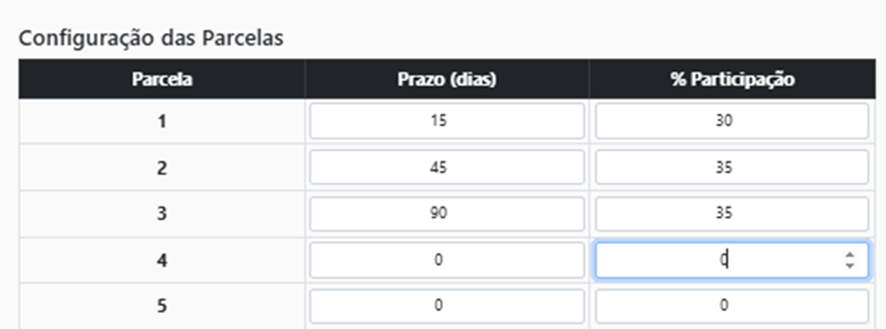 Configuração das Parcelas: Conforme o usuário seleciona/informa a quantidade de parcelas, o sistema já calcula o prazo entre parcelas e a participação de cada uma das parcelas. Mas o usuário poderá fazer alteração conforme desejar.