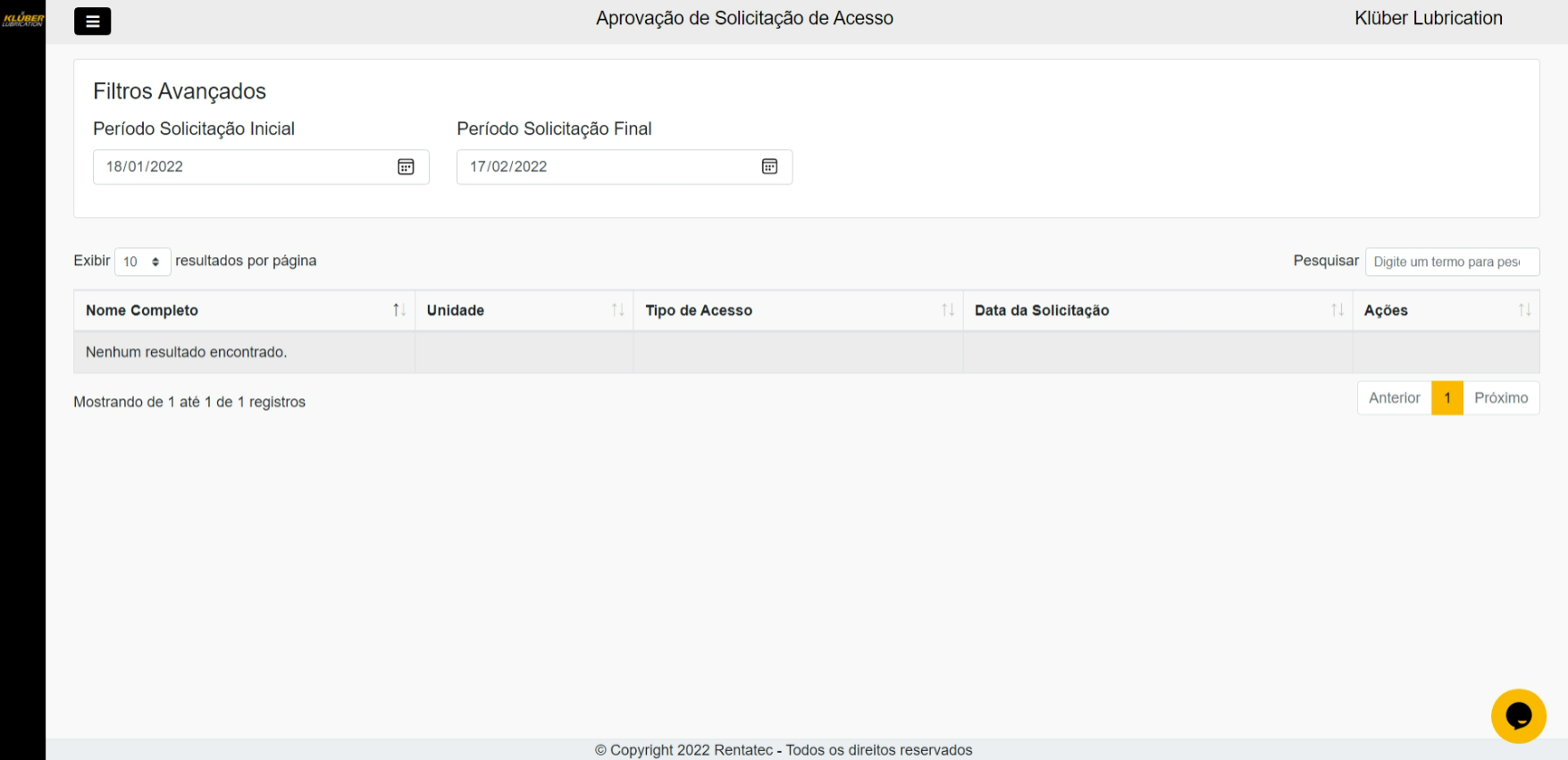 No menu principal, selecione Administração do Sistema > Aprovação de Solicitação de Acesso. Após o carregamento da opção, você irá se deparar com a seguinte tela: