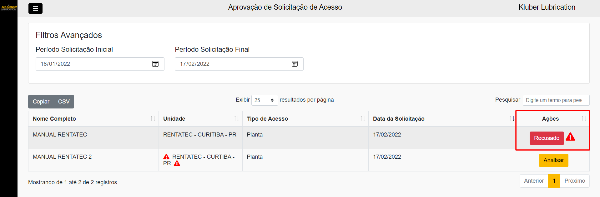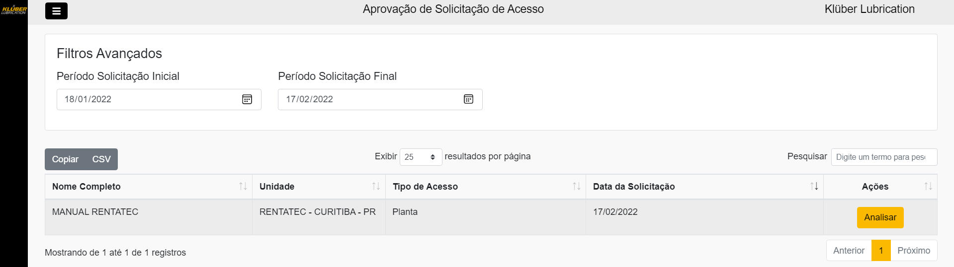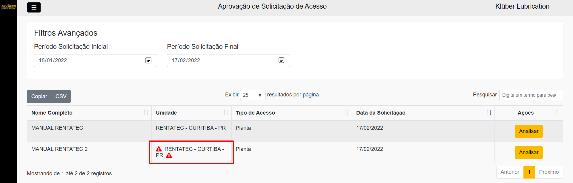 É possível conferir um resumo das informações das soliciações. Em formato de tabela, é possível verificar o Nome Completo, Unidade, Tipo de Acesso (este por padrão vem como Planta) e Data de Solicitação, conforme imagem a seguir:
