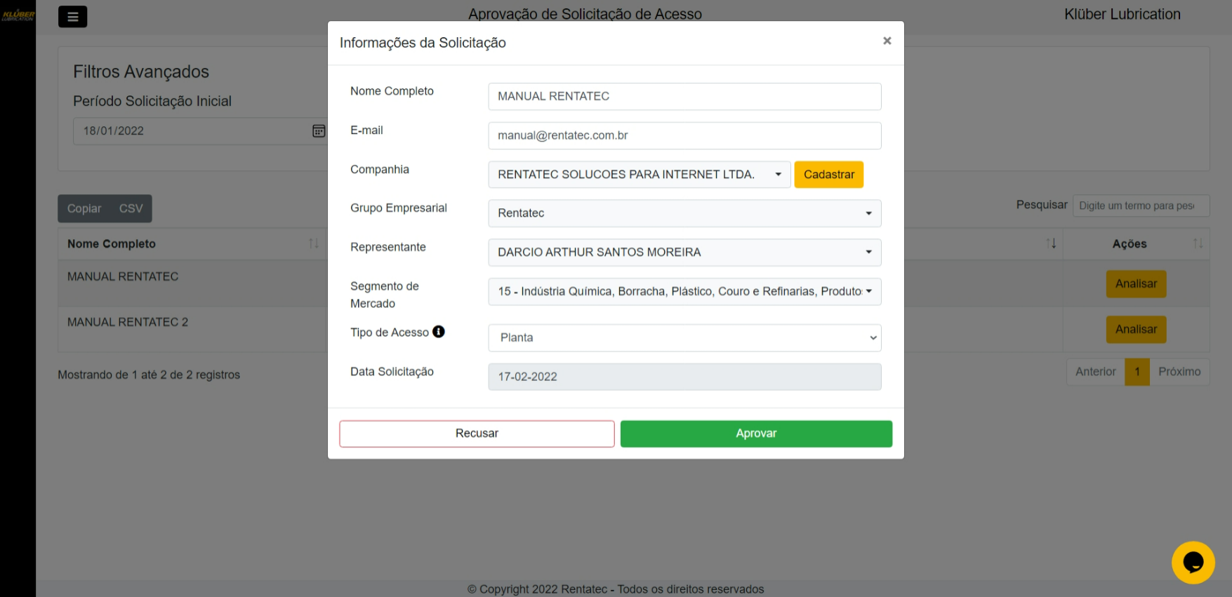 Após conferir todas as informações, existem duas opções: Recusar e Aprovar a solicitação.