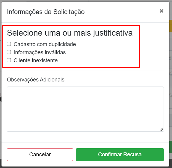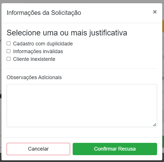 Ao clicar em "Recusar", irá se abrir uma tela perguntando sobre a Justificativa da recusa, conforme imagem abaixo: