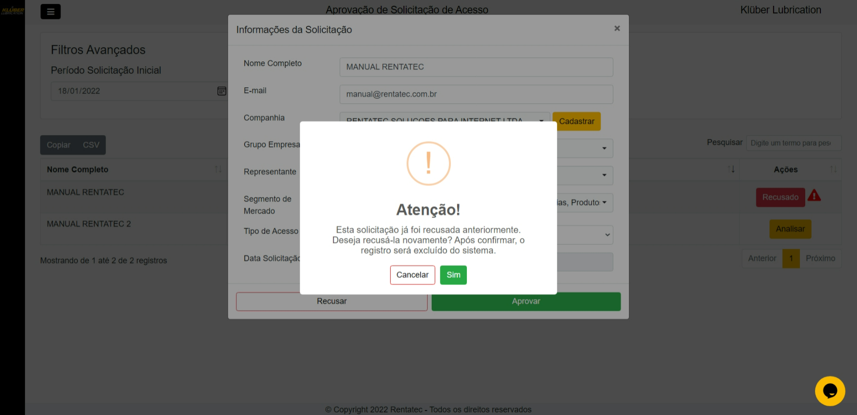Ao clicar em "Recusado" irá abrir a análise da solicitação, podendo "Aprovar" ou "Recusar" novamente. Neste último caso, caso reprovado novamente, o registro sera deletado, porém será necessário confirmar o aviso a seguir: