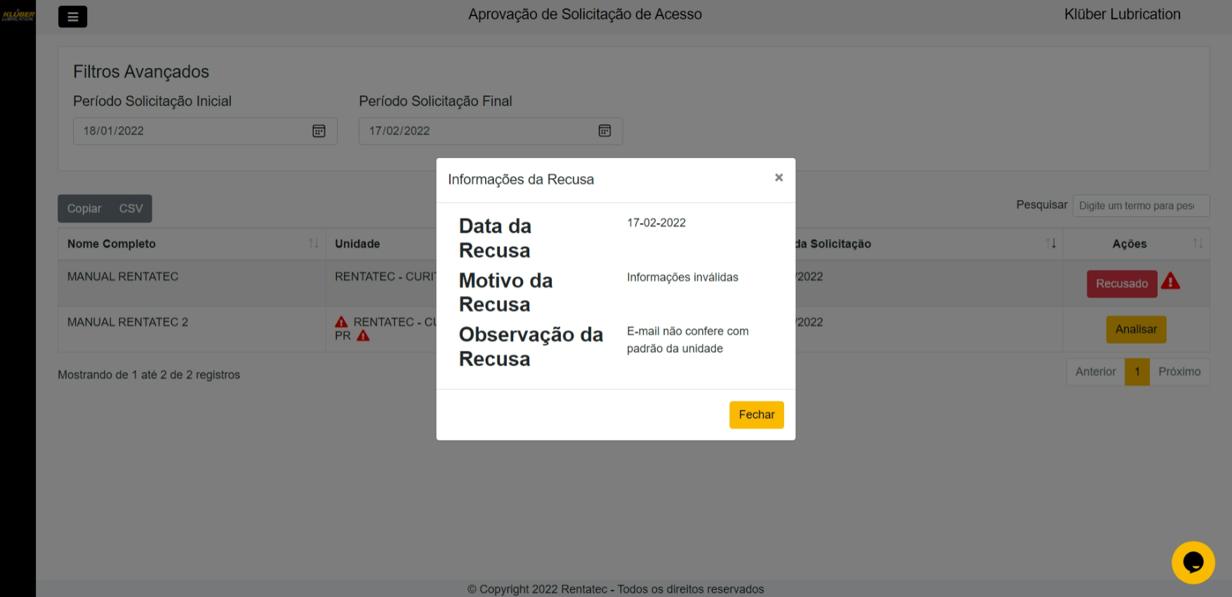 Clicando sobre o ícone de alerta vermeho, será possível conferir o motivo de recusa desta solicitação, conforme imagem a seguir: