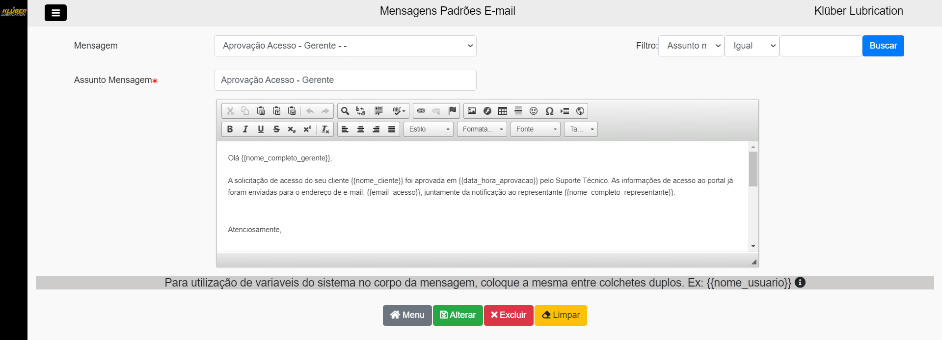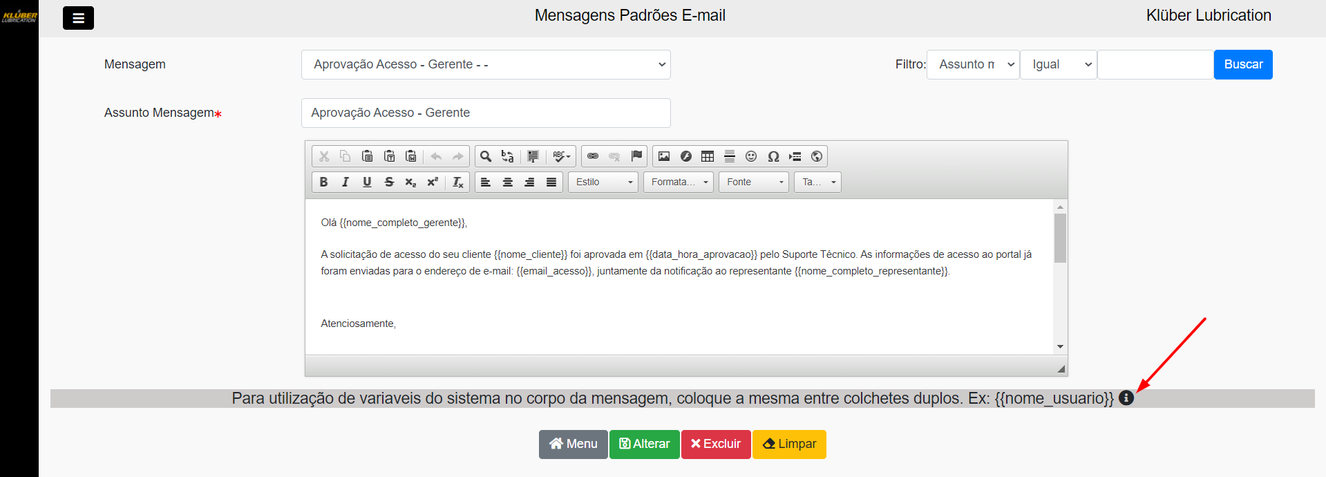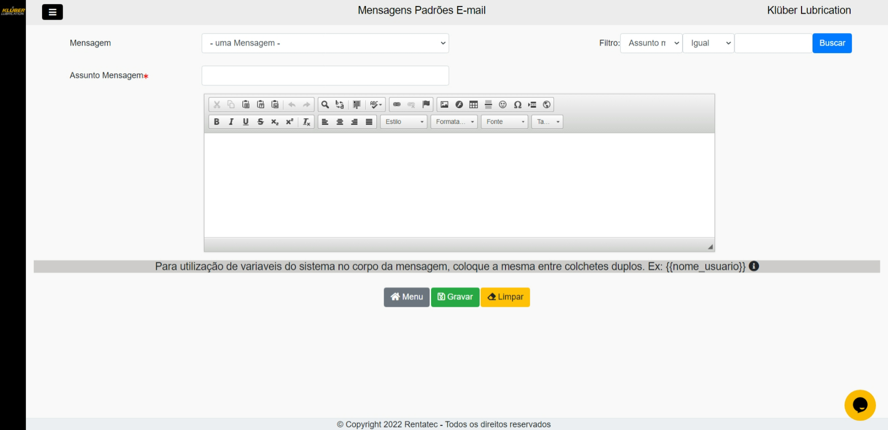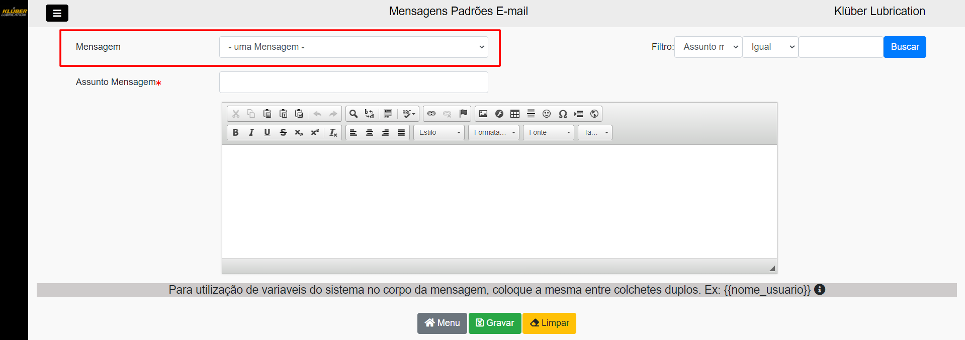 Para utilização de variaveis do sistema no corpo da mensagem, coloque a mesma entre colchetes duplos. Ex: {{nome_usuario}}