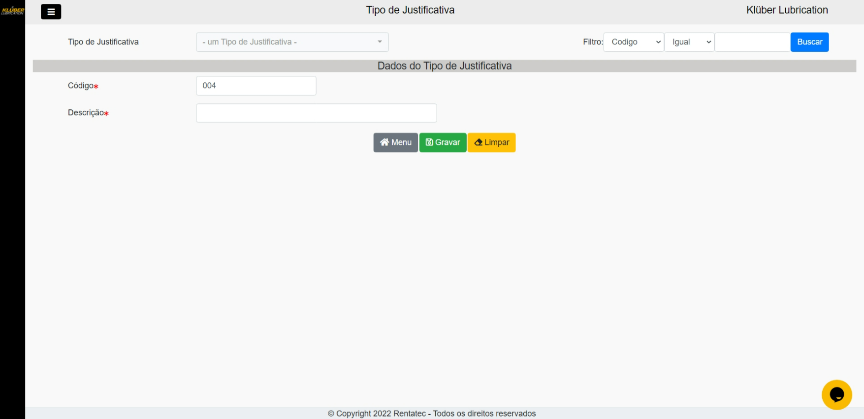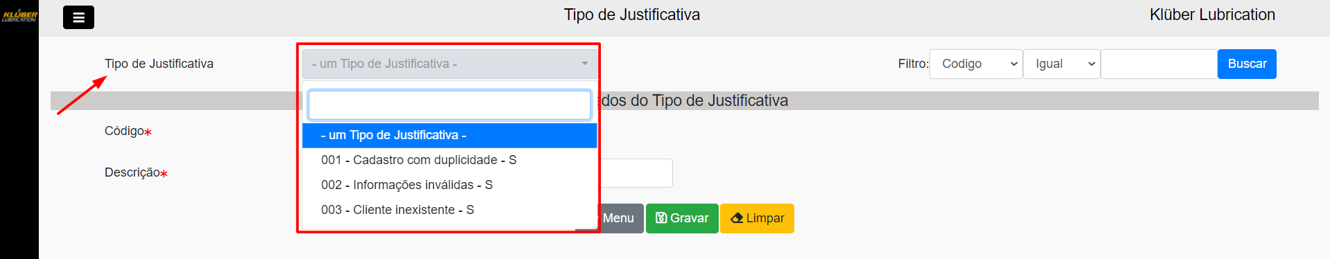 Para cadastrar uma nova justificativa, basta inserir a descrição da justificativa, e em seguida clicar em GRAVAR. O código da Justificativa é gerado automaticamente.
