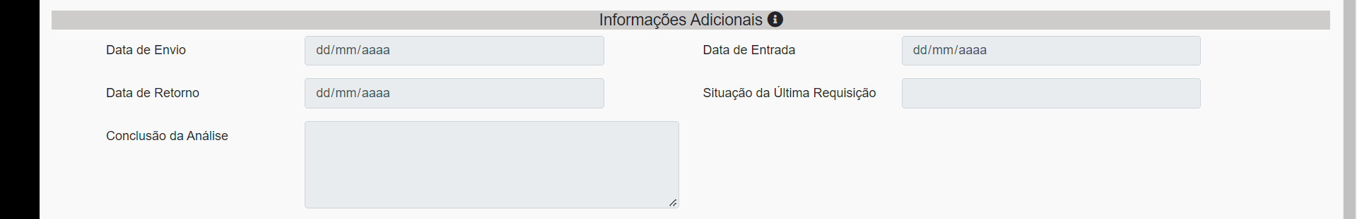 Ainda na tela de Requisição de Análises, é possível conferir uma seção de INFORMAÇÕES ADICIONAIS. Estas informações são atualizadas automaticamente pelo sistema e podem ser utilizadas para consultar uma requisição diretamente.