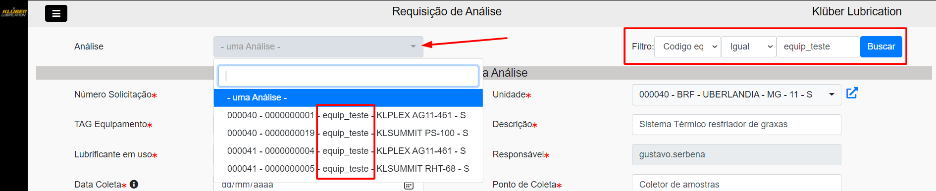 - TAG Equipamento: Selecione o equipamento da unidade que deseja realizar a requisição de análise.