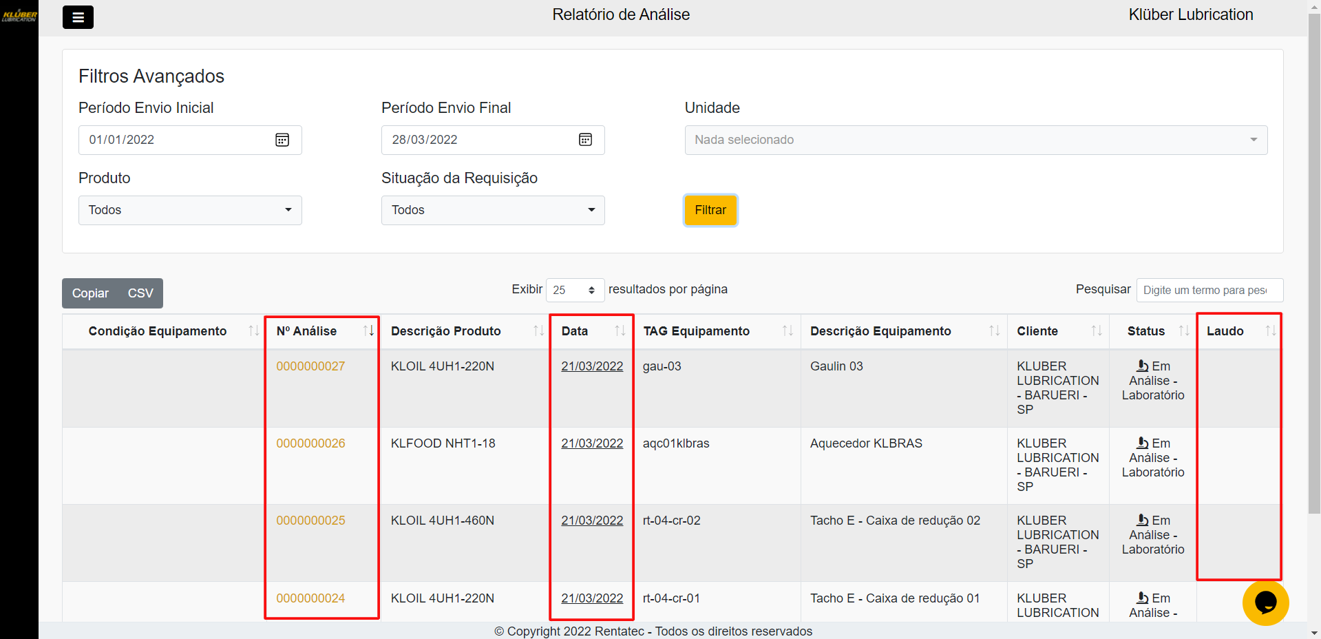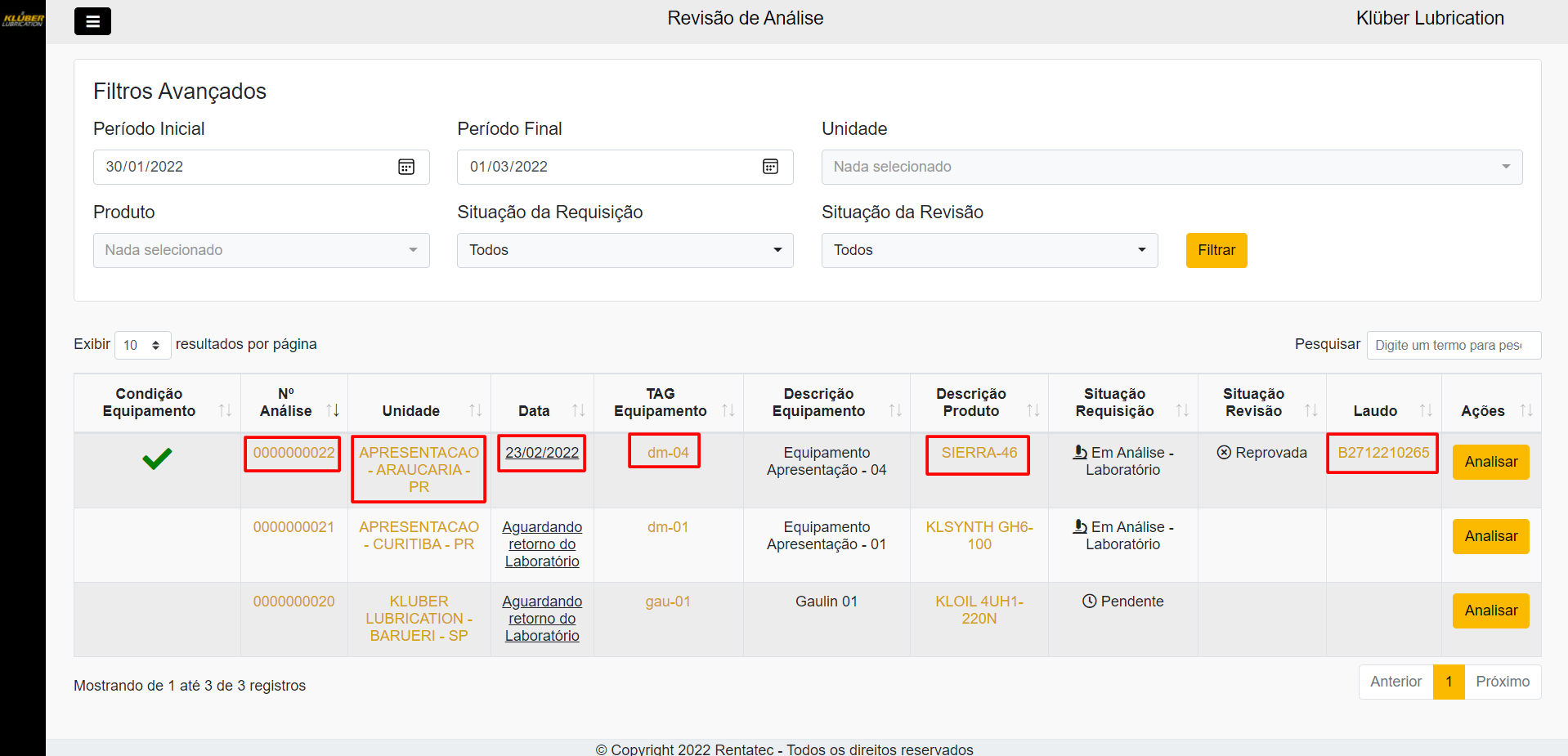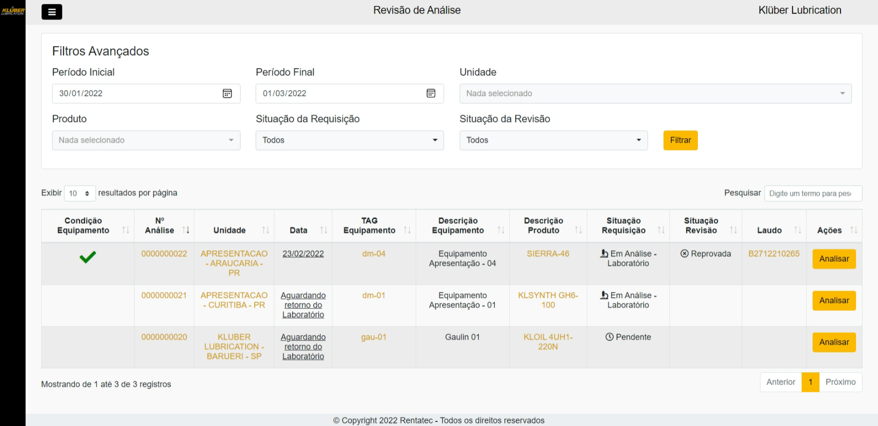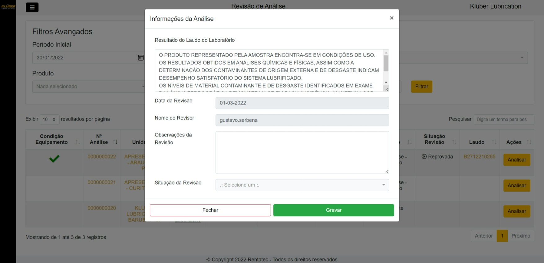 O programa de Relatório de Análise, tem como objetivo realizar o fluxo de revisão e aprovação de laudos das requisições de análises realizadas no Portal de Engenharia de Aplicação 4.0 da Klüber Lubrication.
