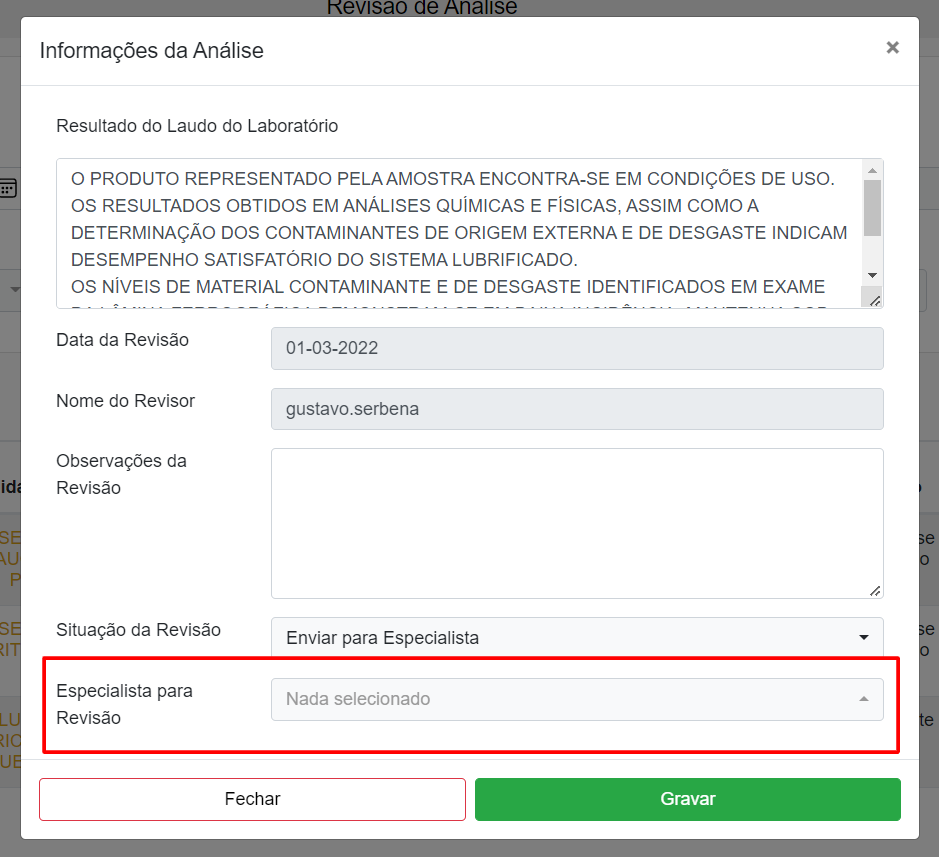 Esta situação, o revisor irá considerar que pode existir uma divergência de informação com o laudo ou apenas gostaria de verificar se sua análise está correta, antes de disponibilizar para o cliente. Ao selecionar a opção ENVIAR PARA ESPECIALISTA, irá se abrir um campo para selecionar o Assessor Técnico responsável pela a unidade, conforme imagem a seguir. Informe a opção desejada e clique em GRAVAR.