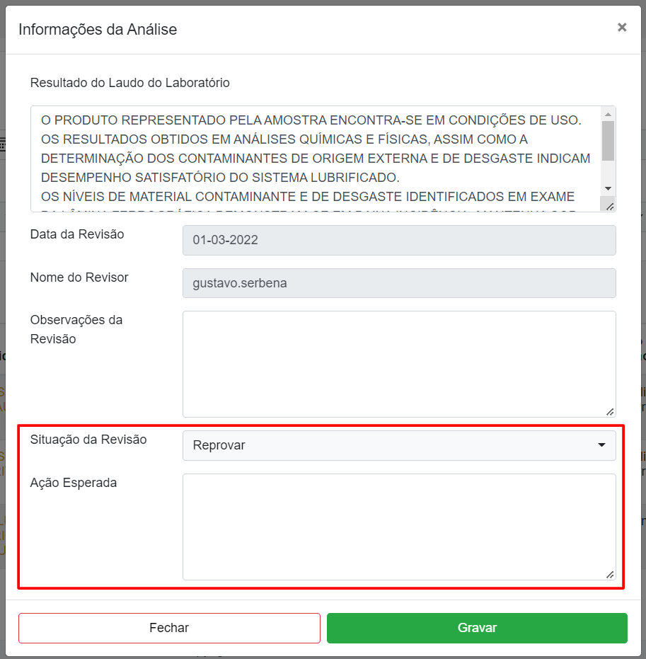 O campo de Ação Esperada é o local onde deve ser informado as considerações que será enviadas juntamente com o e-mail de solicitação de reanálise para o laboratório.