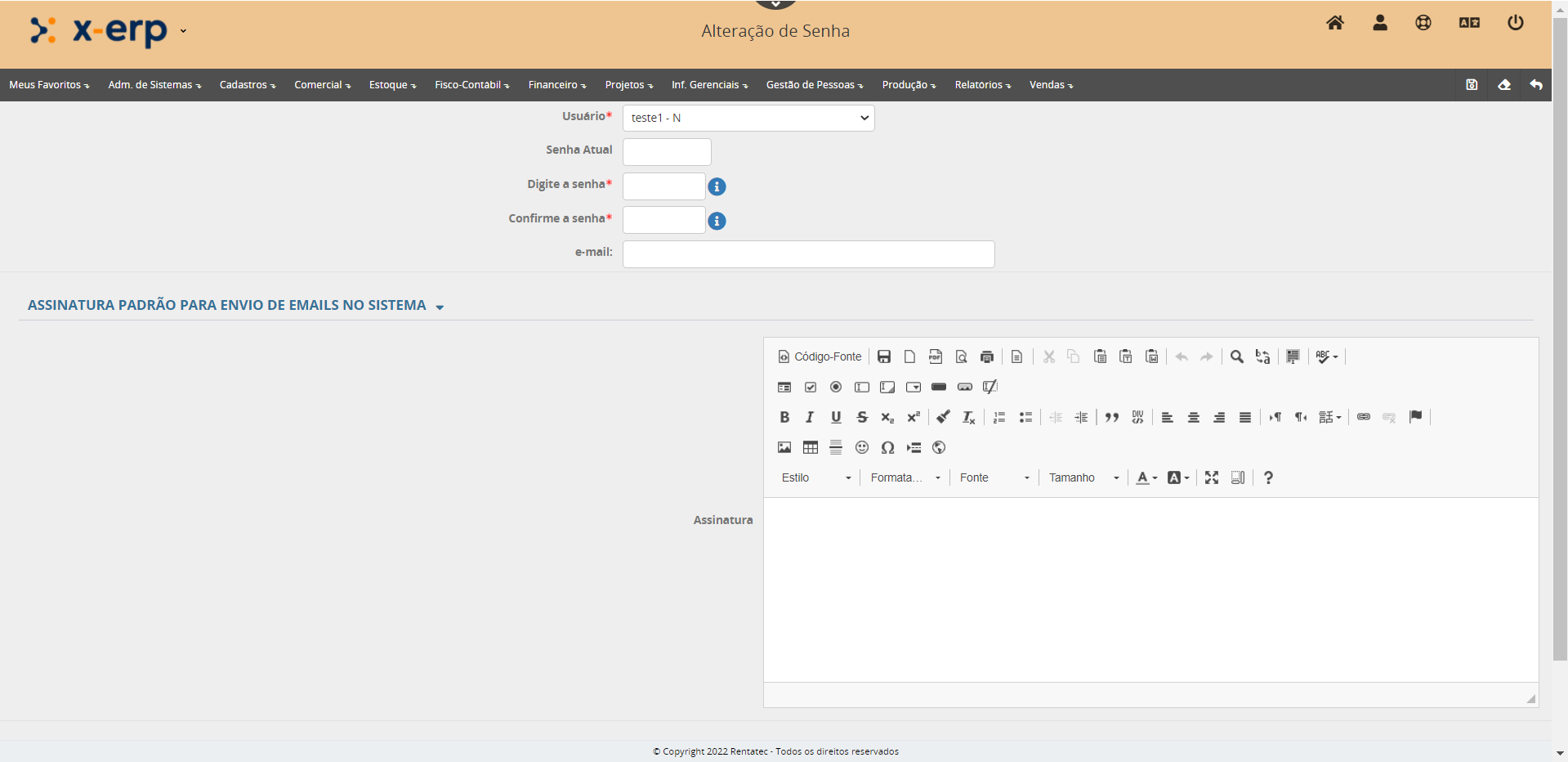 Usuário: Seu usuário irá aparecer selecionado para a troca de senha. Em caso de ser adminstrador do sistema, poderá selecionar qual usuário deseja trocar a senha.