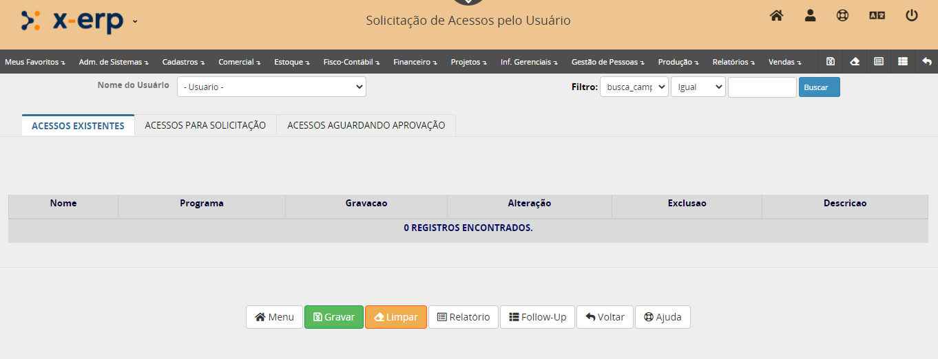No menu principal, selecione: Adm. de Sistemas > Usuário > Solicitação de Acessos pelo Usuário
