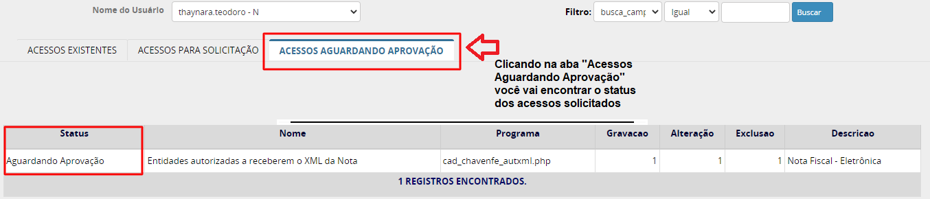 Na aba de "ACESSOS AGUARDANDO APROVAÇÃO" irá ficar da seguinte forma