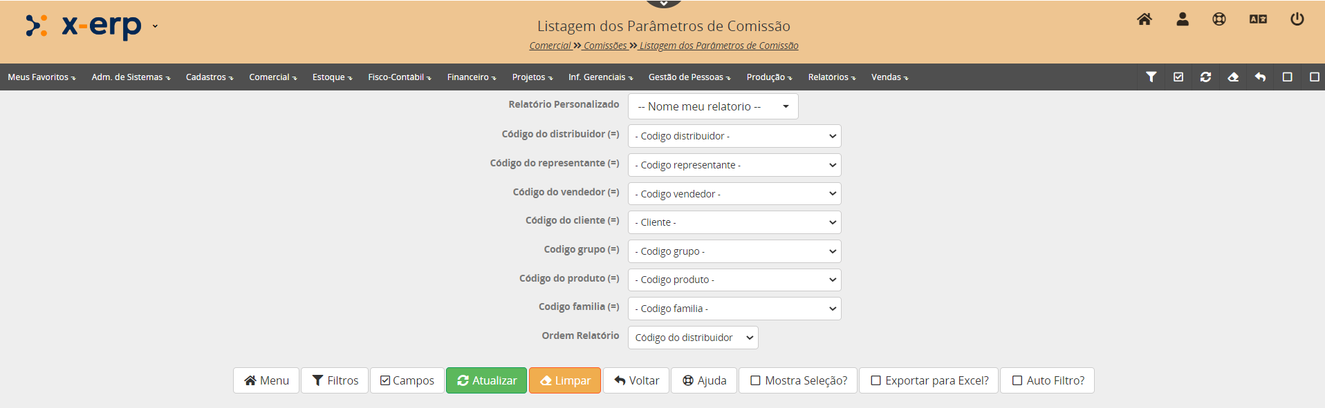 No menu principal, selecione: Comercial -> Comissões -> Parâmetros da Comissão