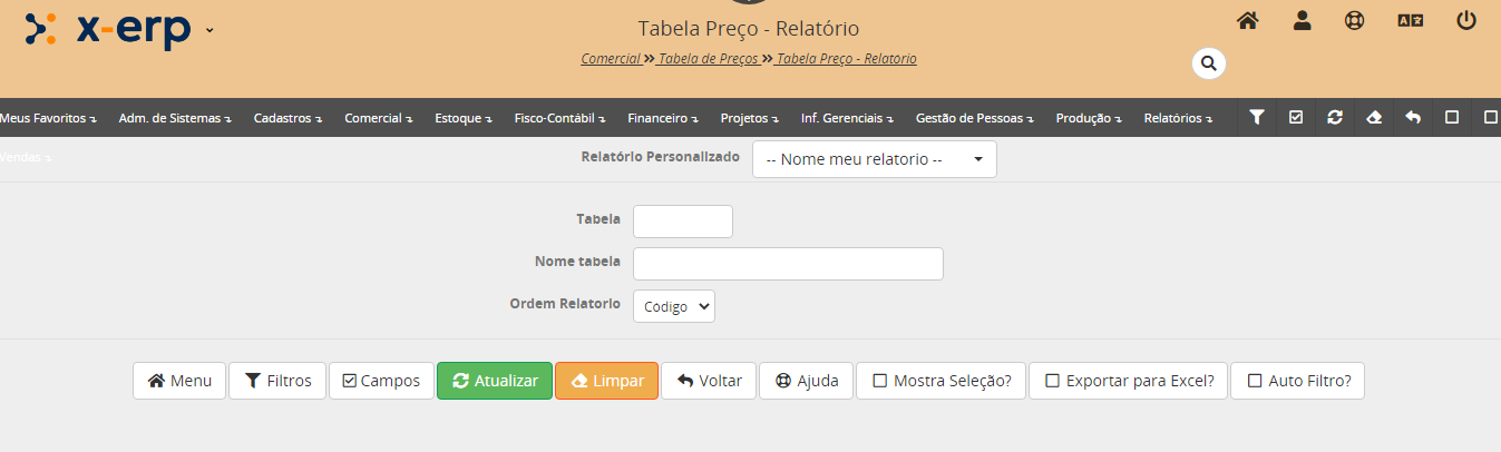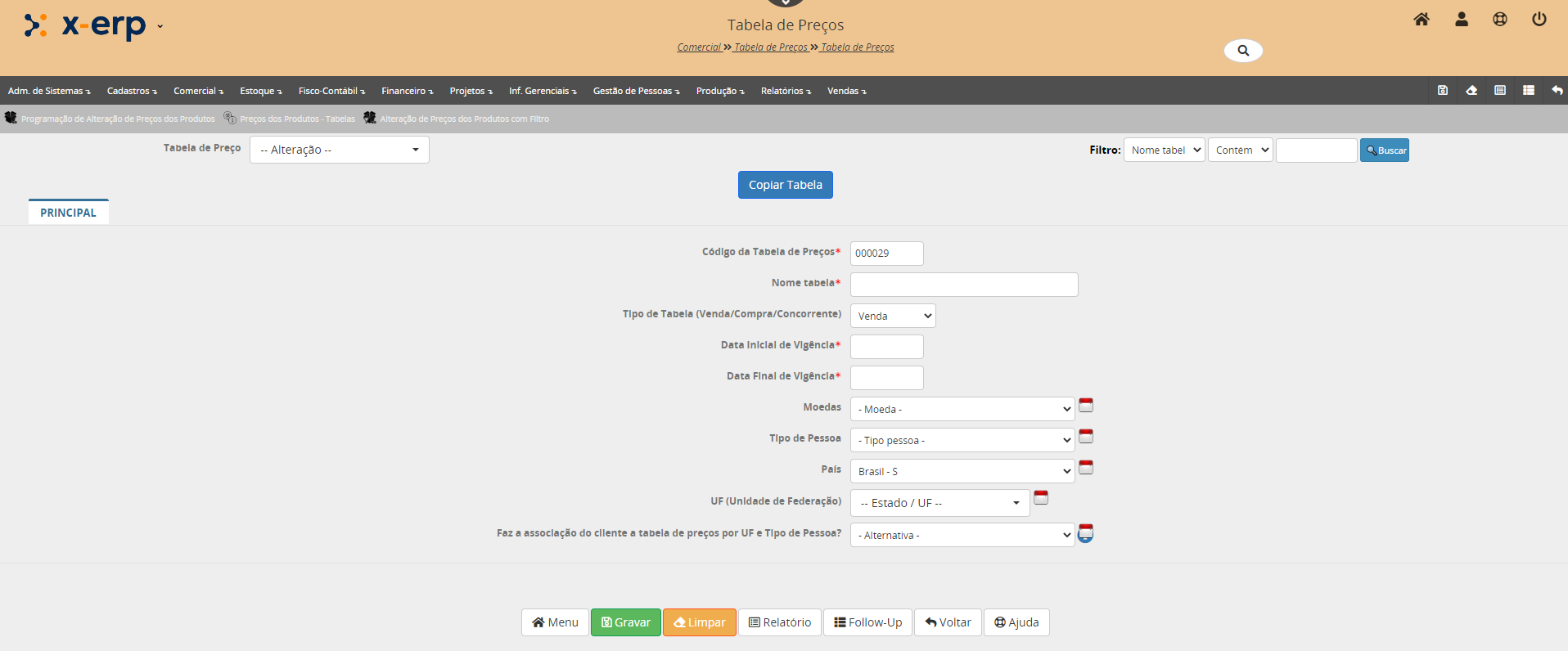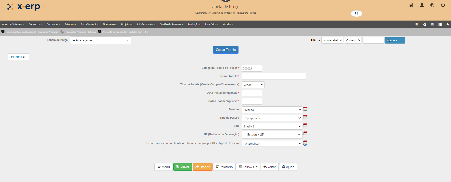 No menu principal, selecione: Comercial > Tabela de Preços > Preço dos Produtos - Tabela de Preço