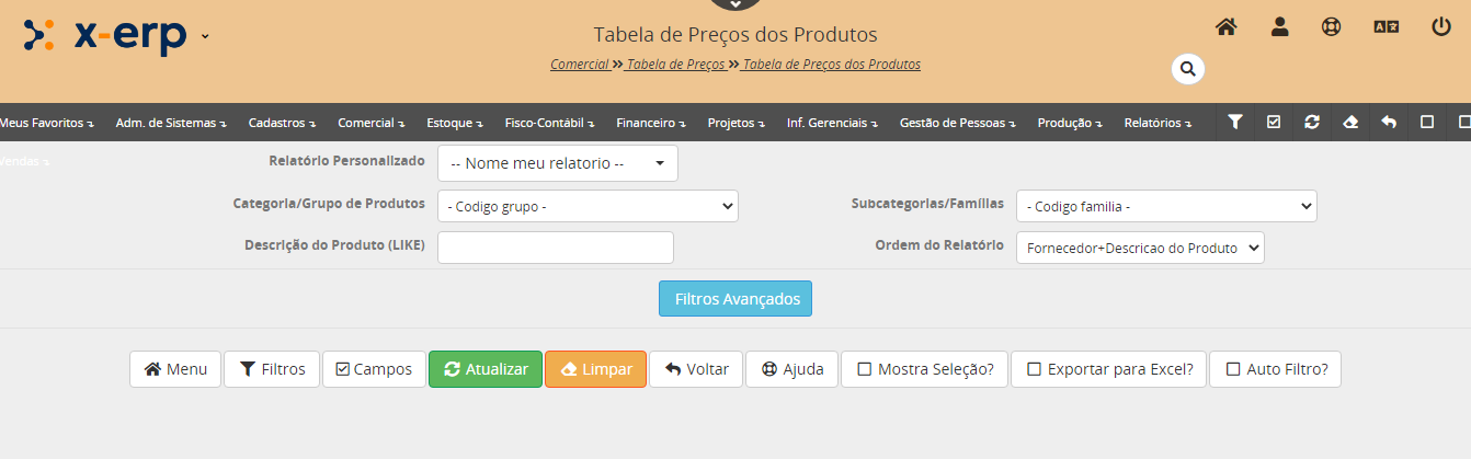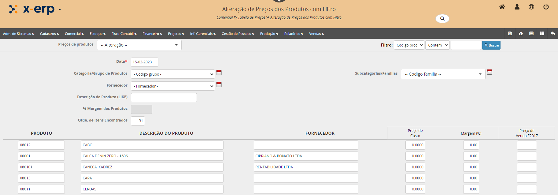 O programa Alteração de Preços dos Produtos com Filtro tem como objetivo cadastrar os preços de produtos conforme filtros por fornecedor ou descrição parcial do produto.