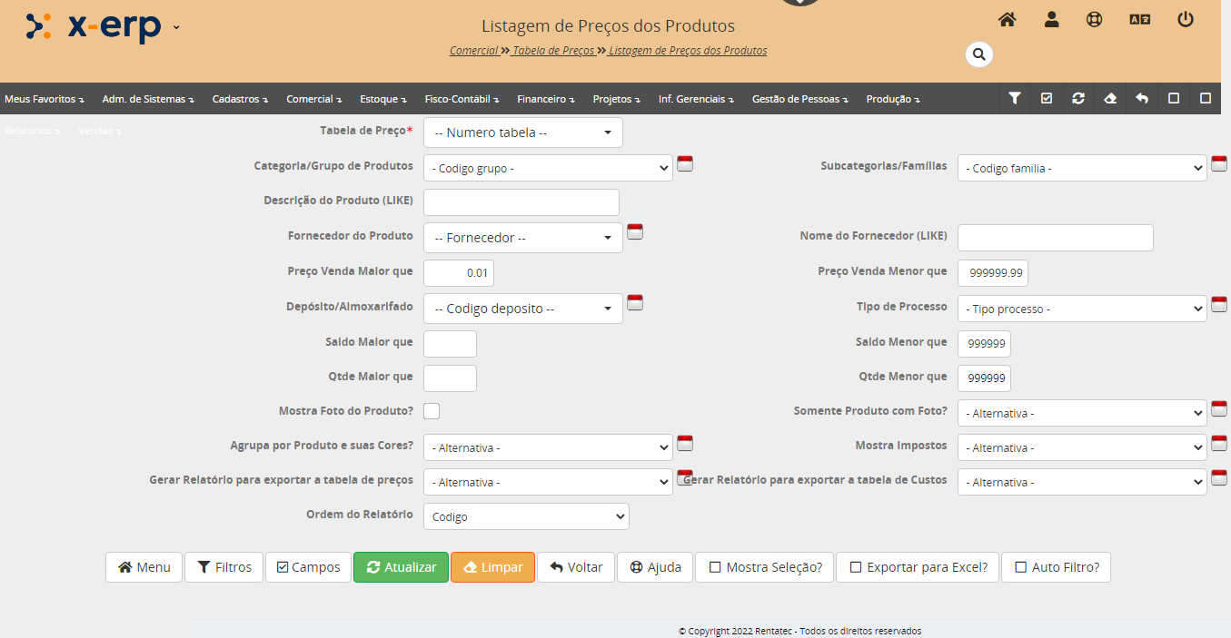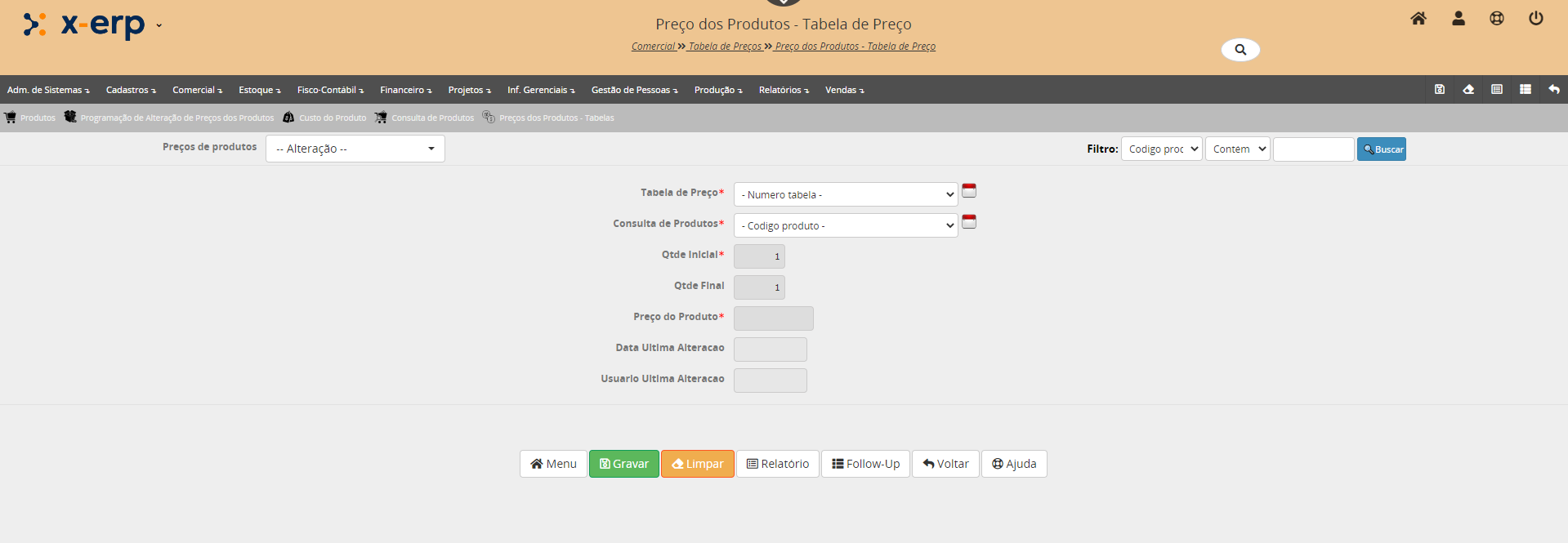 No menu principal, selecione: Comercial > Tabela de Preços > Alteração de Preços dos Produtos com Filtro