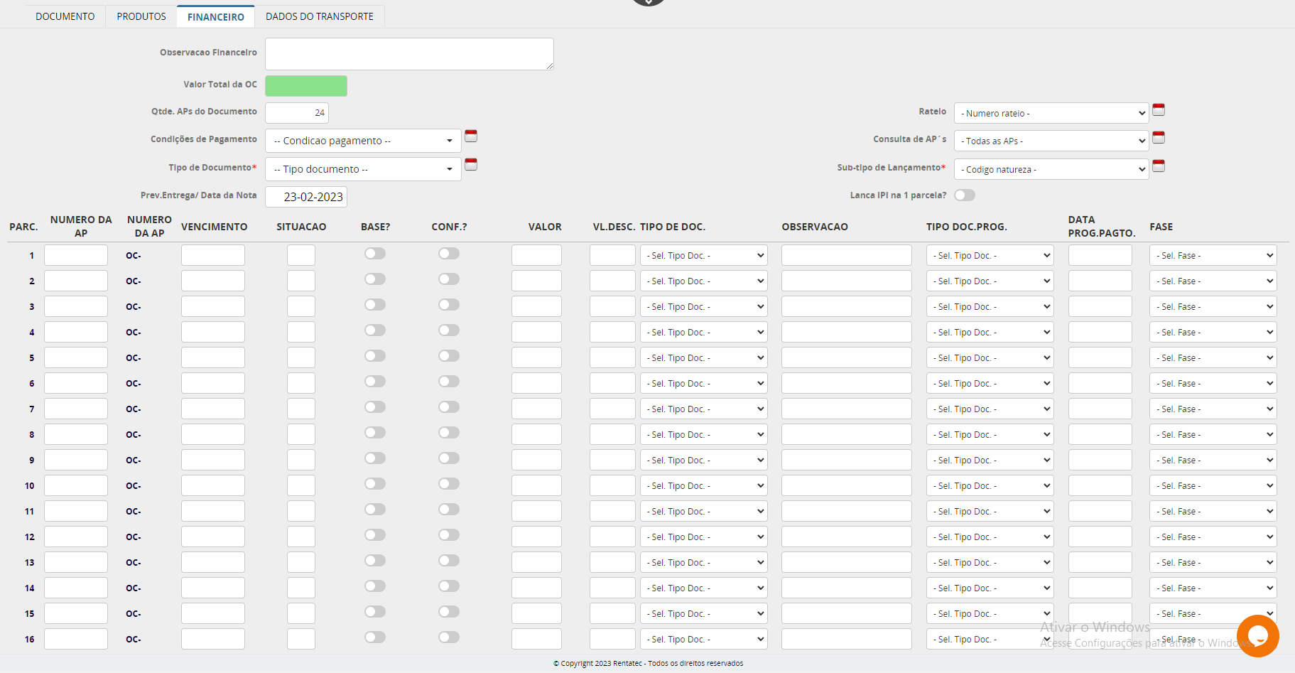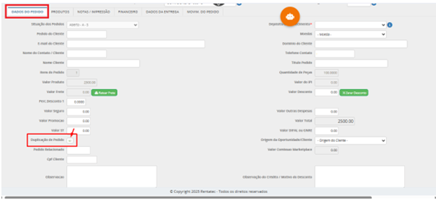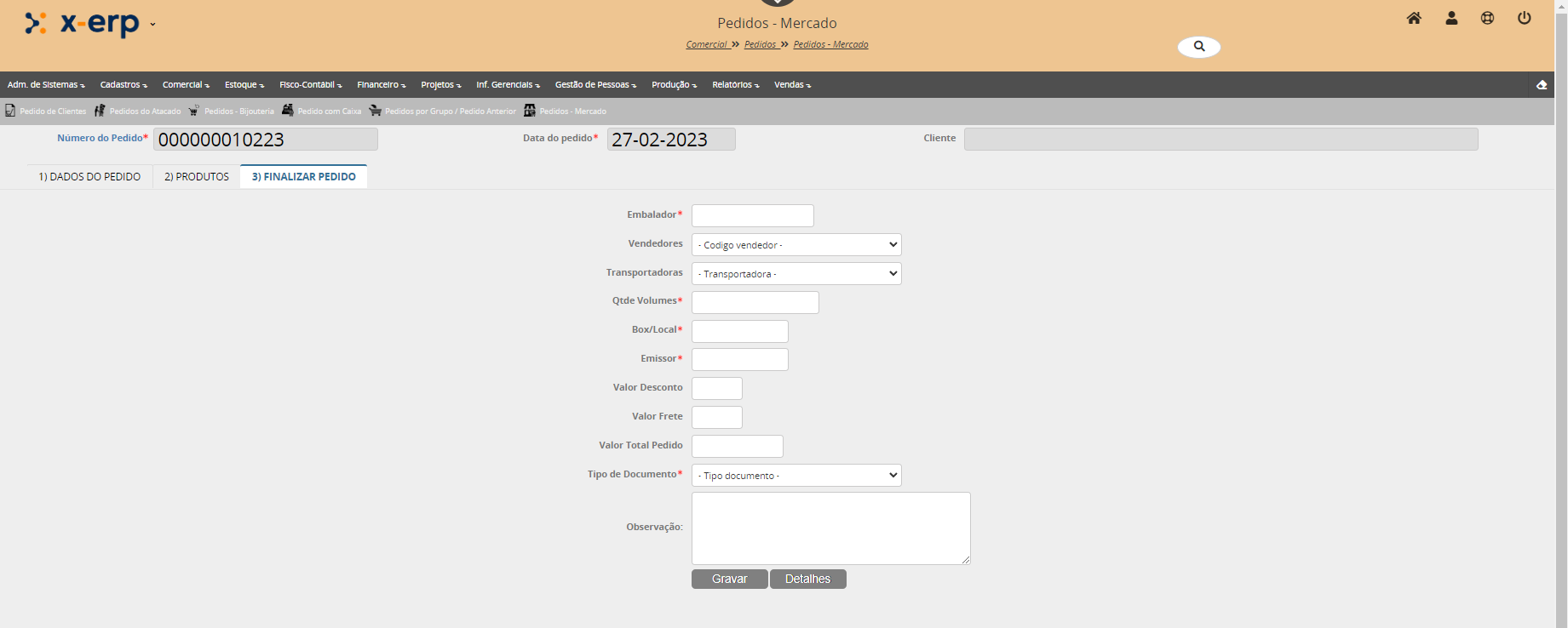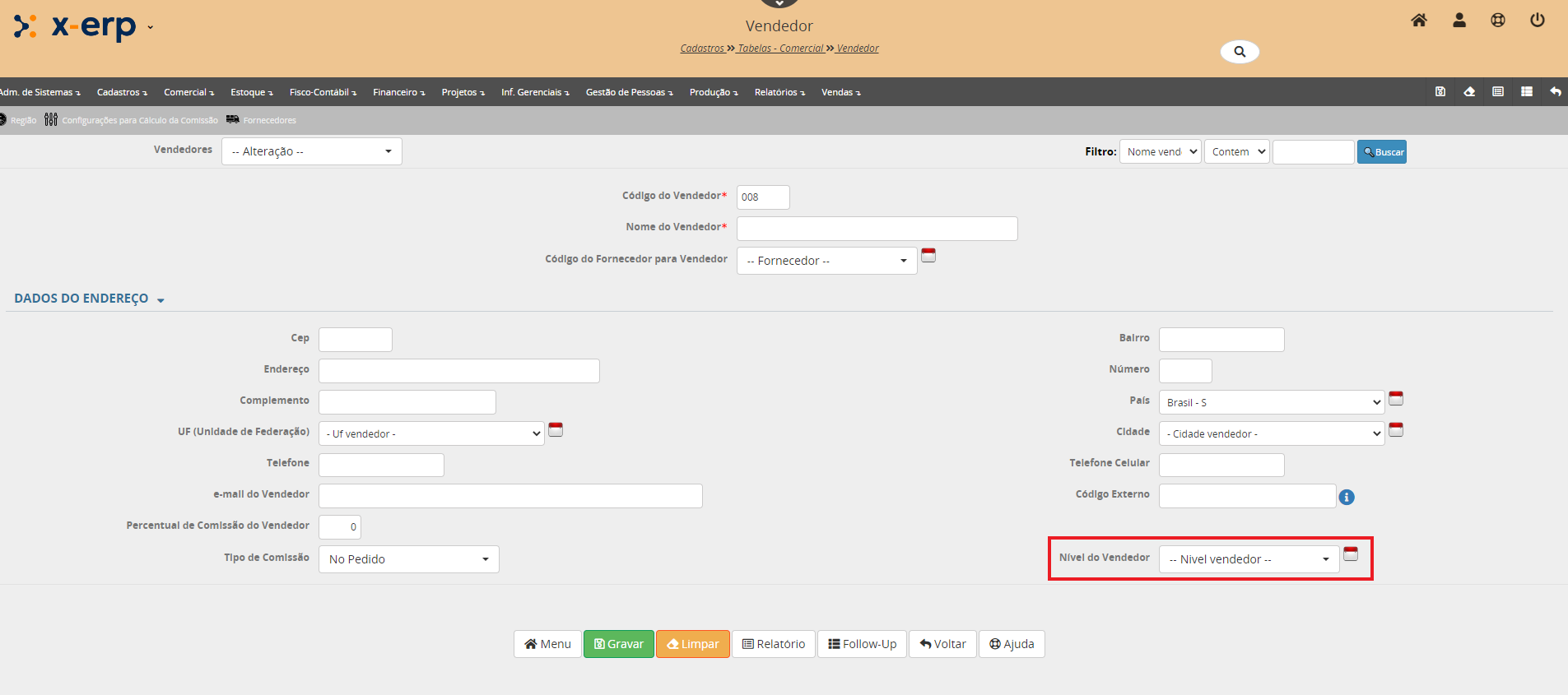 A seguir é mostrado o formulário de preenchimento da comissão no pedido.