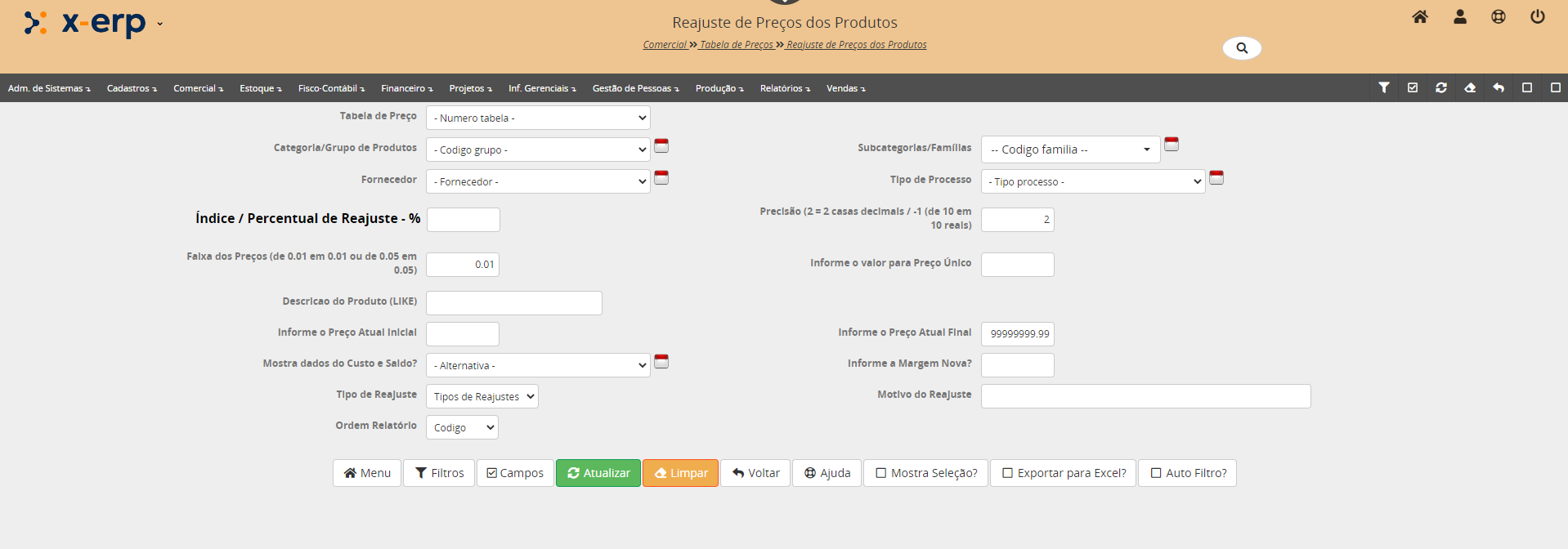 No menu principal, selecione: Comercial > Tabela de Preços > Reajuste de Preço dos Produtos