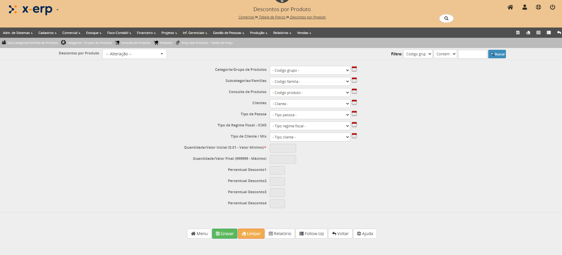 O programa Descontos por Produto tem como objetivo cadastrar os descontos que podem ser por produtos, por cliente, por tipo de pessoa.