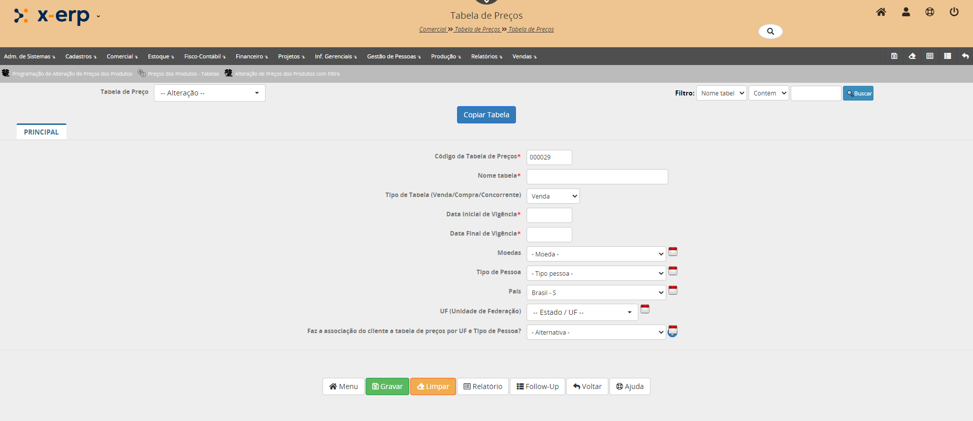 No menu principal, selecione: Comercial > Tabela de Preços > Cópia de Dados entre Tabelas.