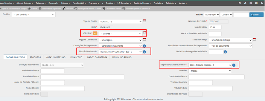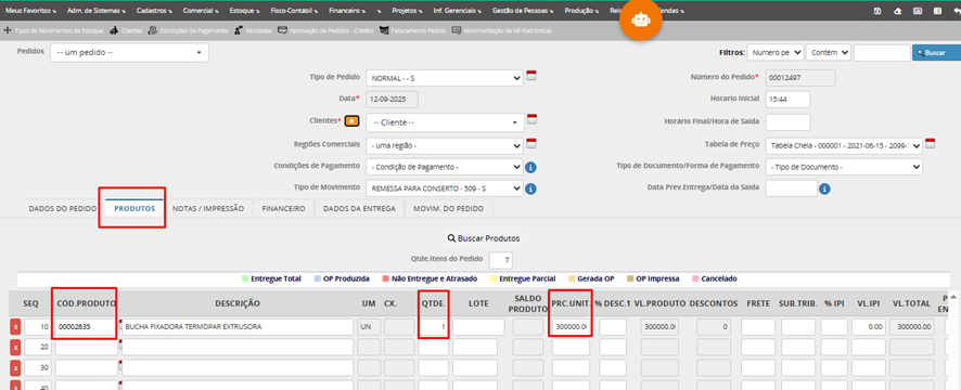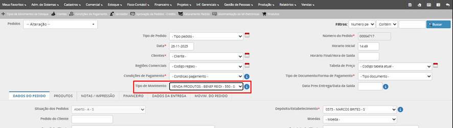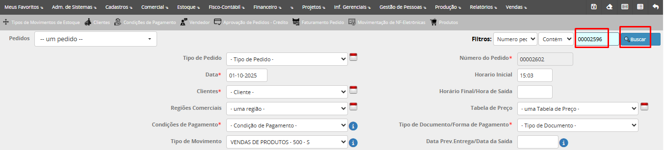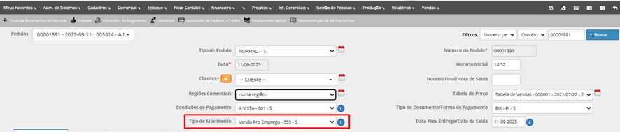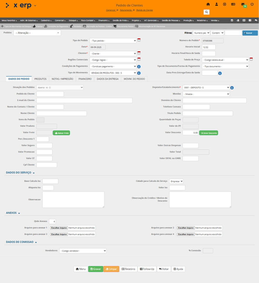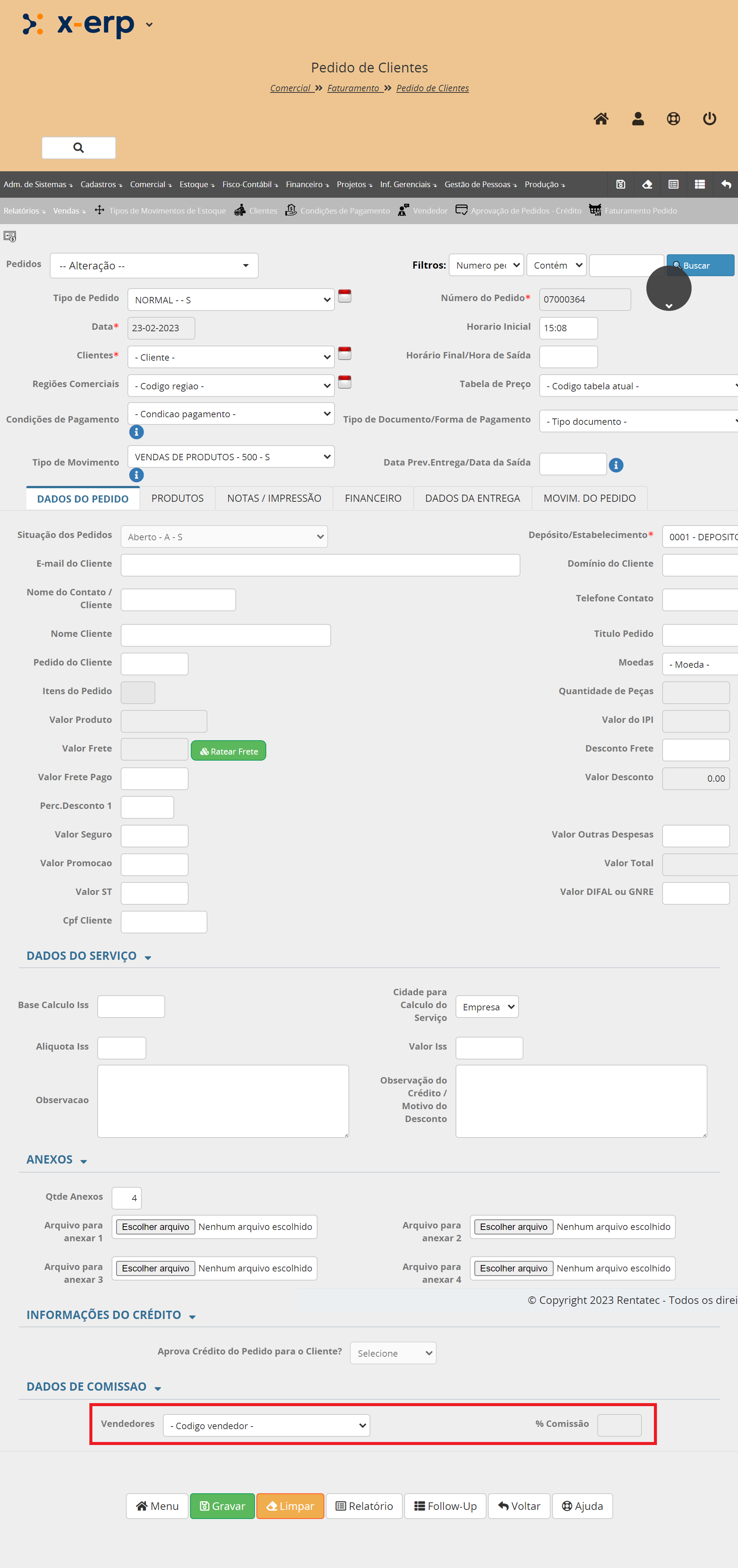 O cadastro de Comissão no Pedido é acessado pelo programa pedido de Cliente.