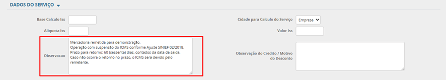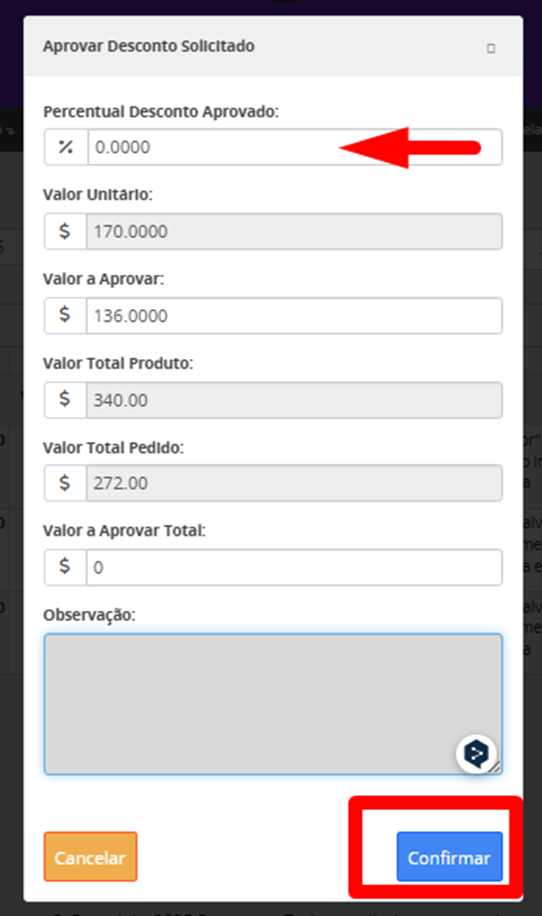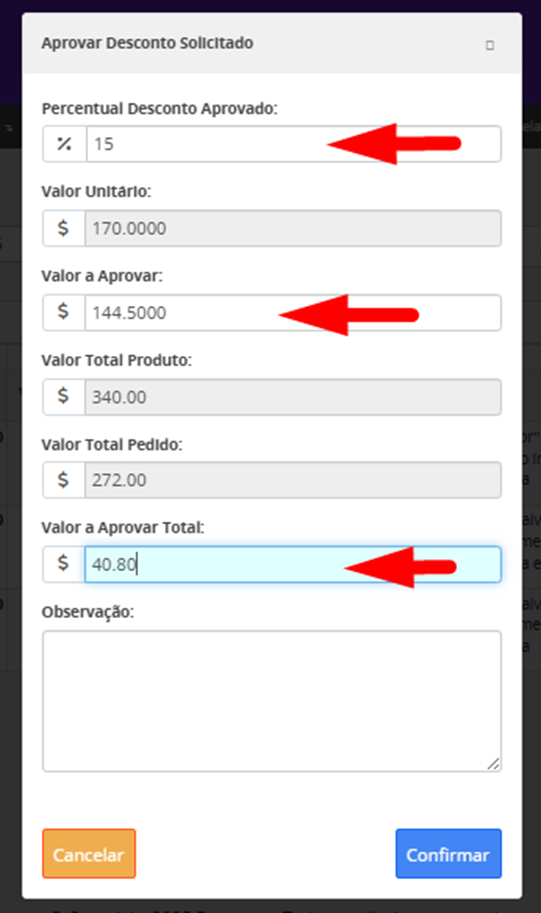 Observação: Texto livre de observação da aplicação da comissão para o pedido.