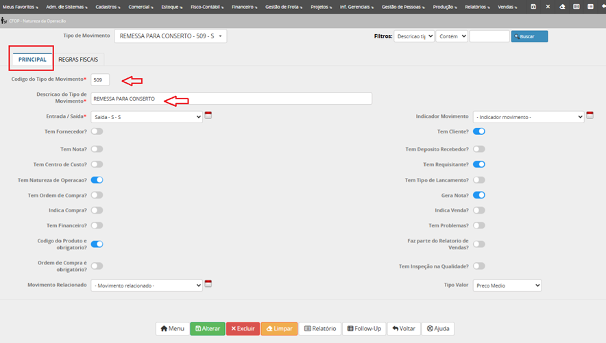 Grupo de Produtos: Seleciona o grupo produto. O sistema lista os grupos de produtos cadastrados.