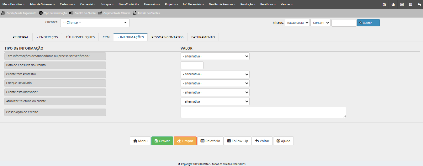 Tipo de Cliente / Mix: Filtro por tipo de cliente, conforme opções cadastradas previamente.