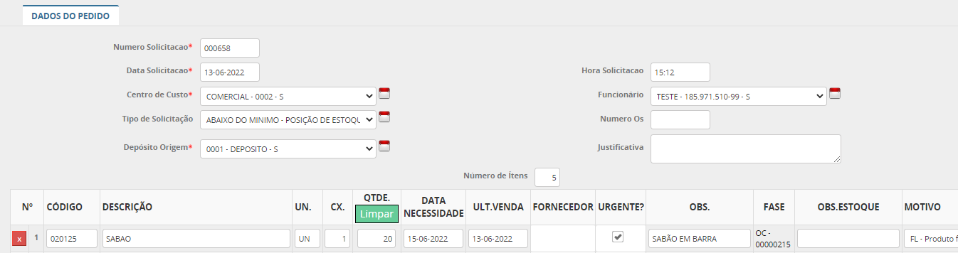 A parte inferior do formulário traz os itens solicitados e suas respectivas quantidades.