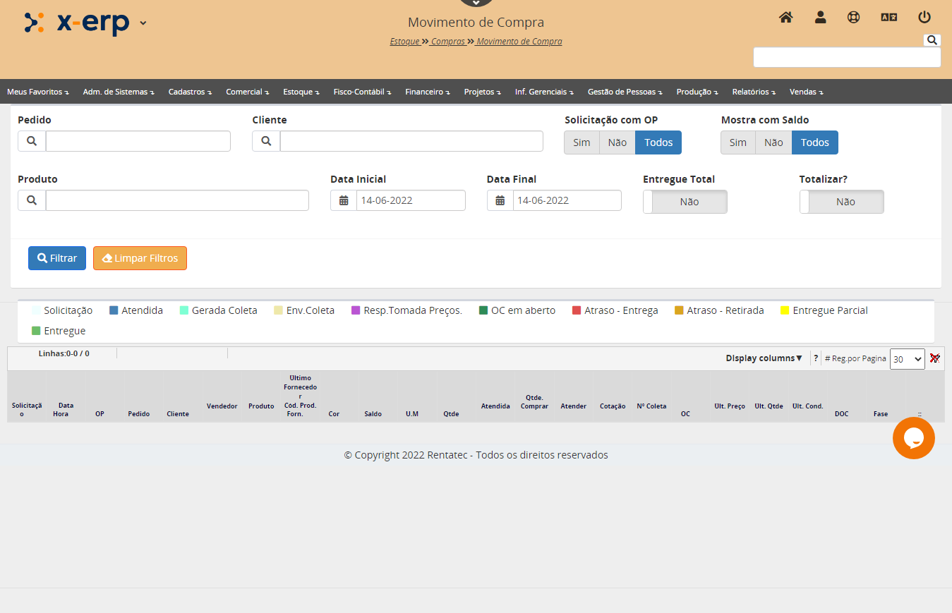 No menu principal, selecione: Estoque > Solicitação de Materiais > Sem Mov. no Período