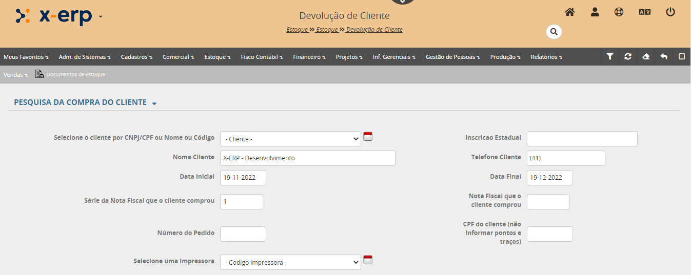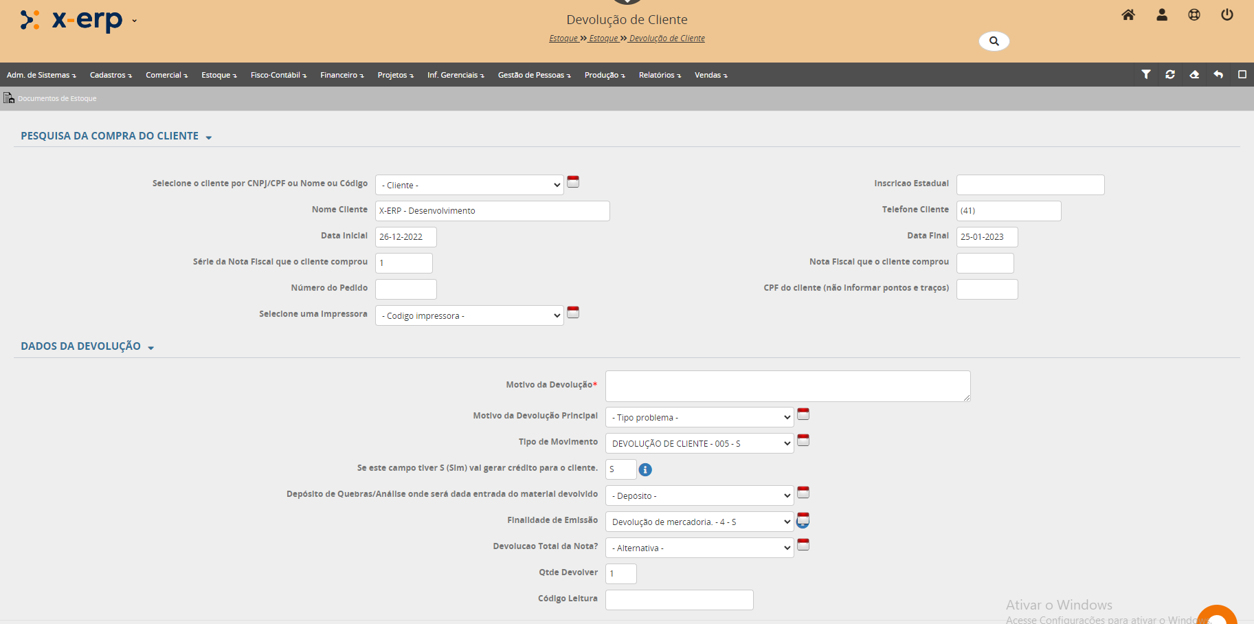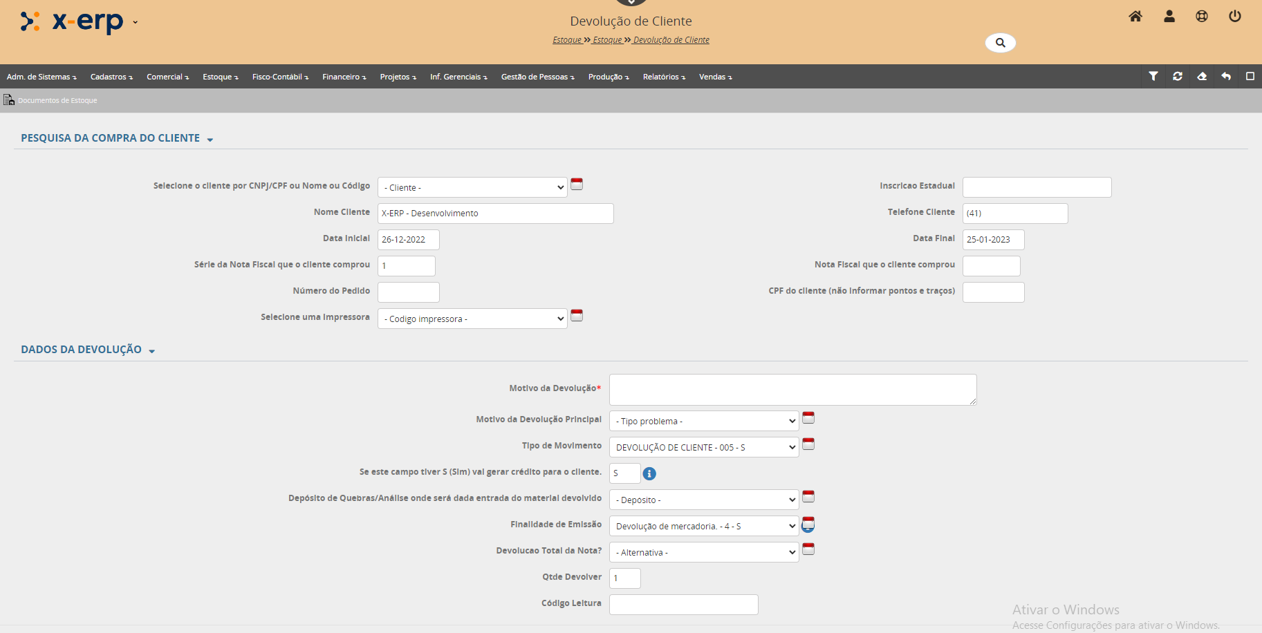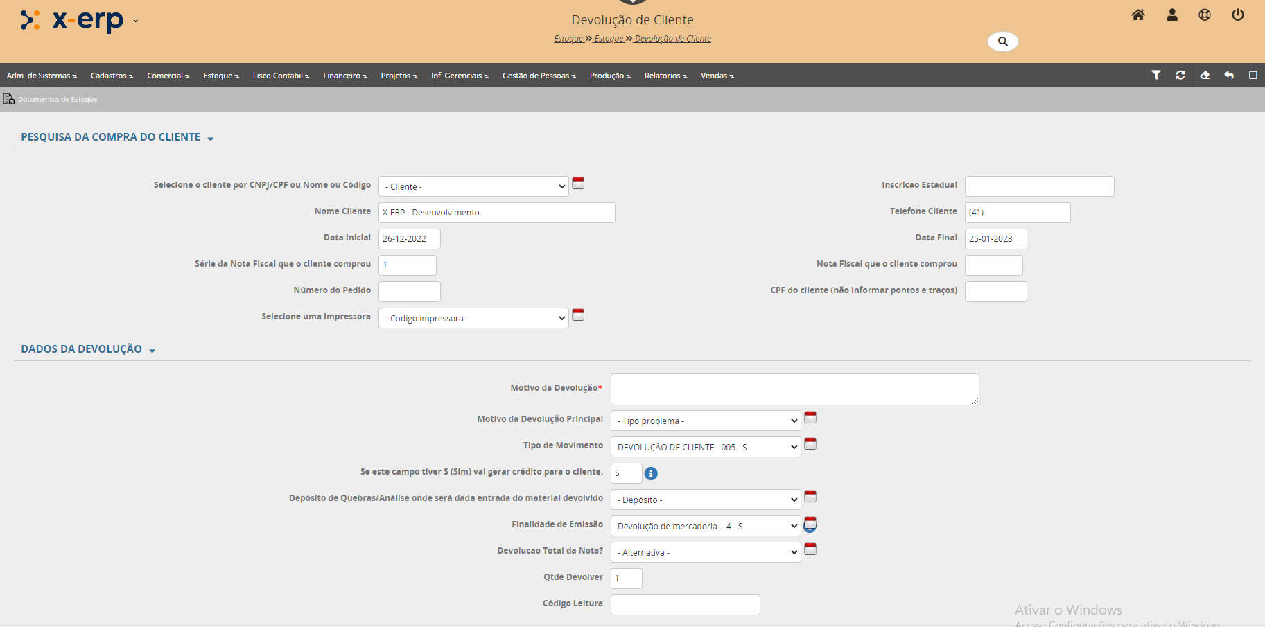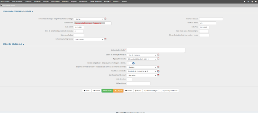 No menu principal, selecione: Estoque > Estoque > Devolução de Cliente.