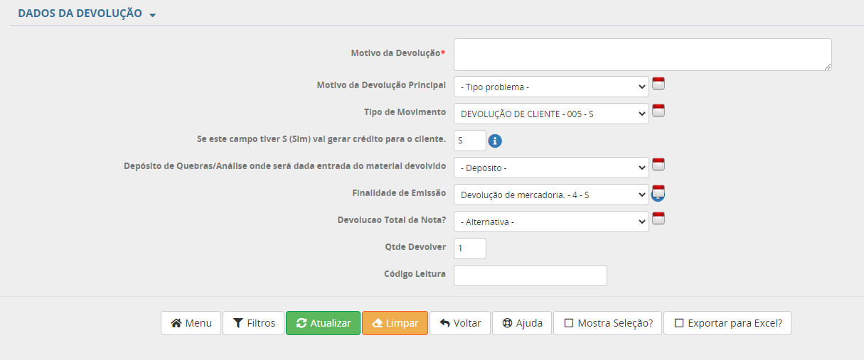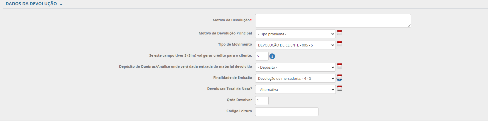 ➢Preenche os campos obrigatórios do formulario de devolução. caso o cliente não possua nota de devolução, o sistema poderá gerar automaticamente;