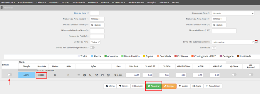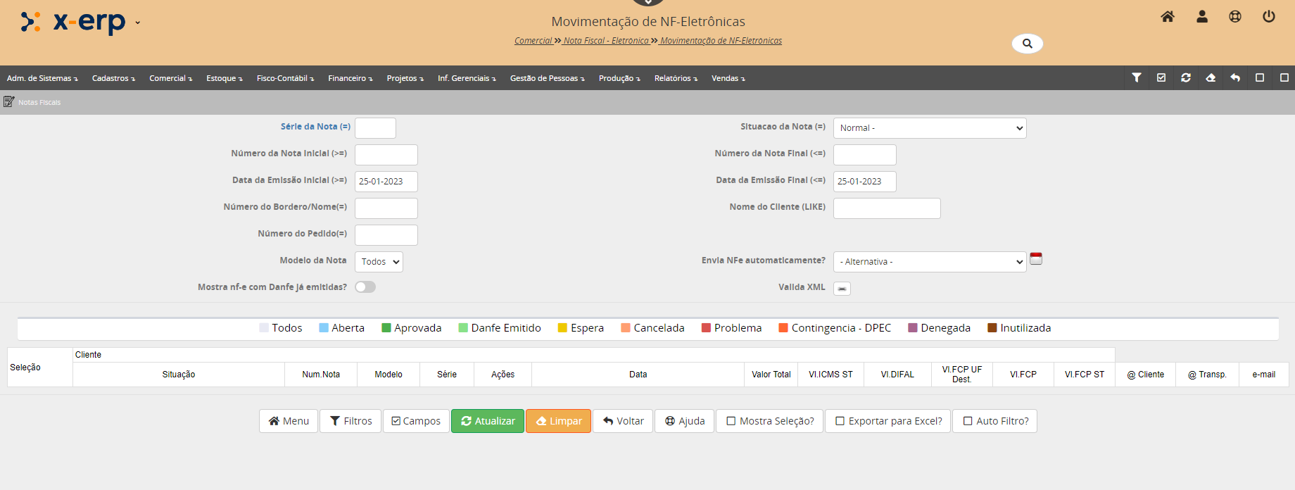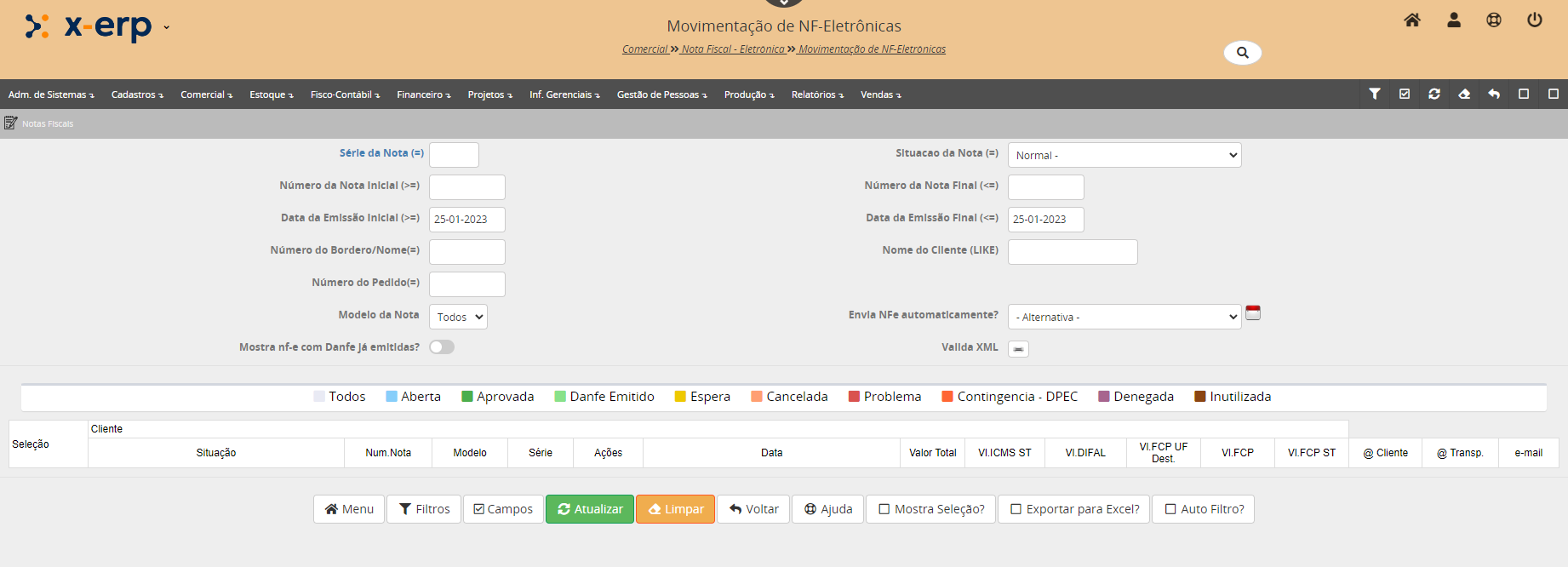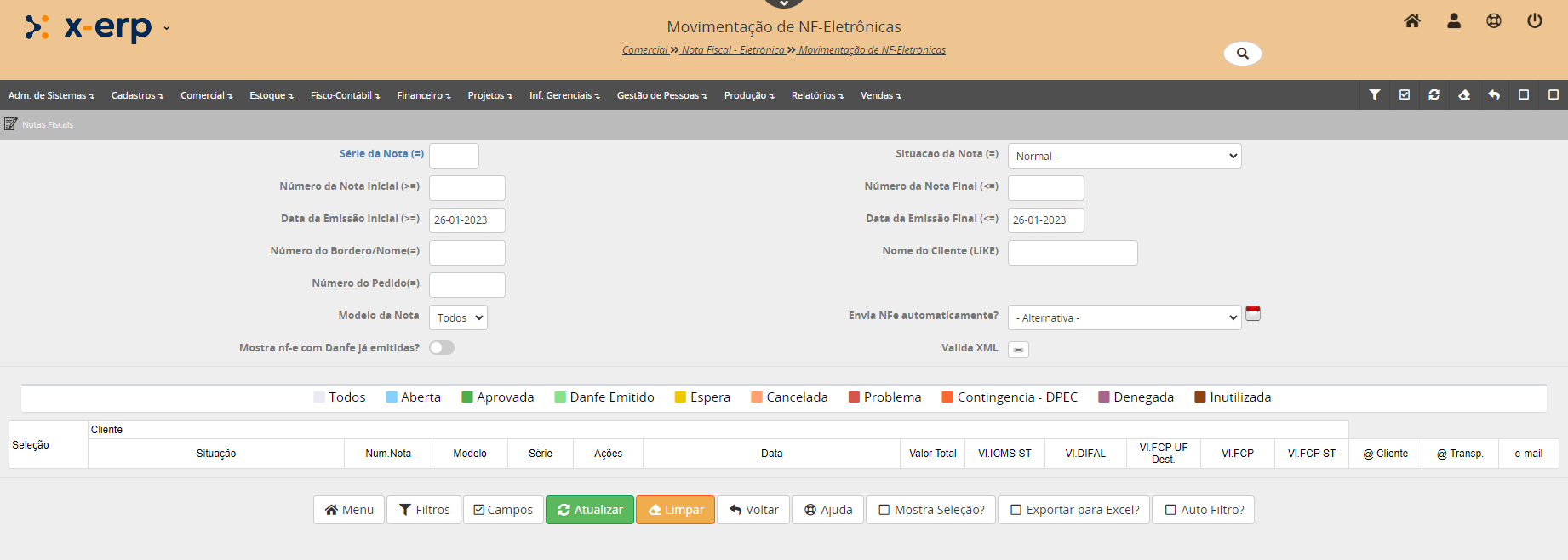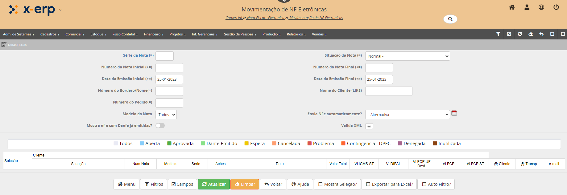 No menu principal, selecione: Comercial > Nota Fiscal Eletrônica > Movimentação de NF-Eletrônicas.