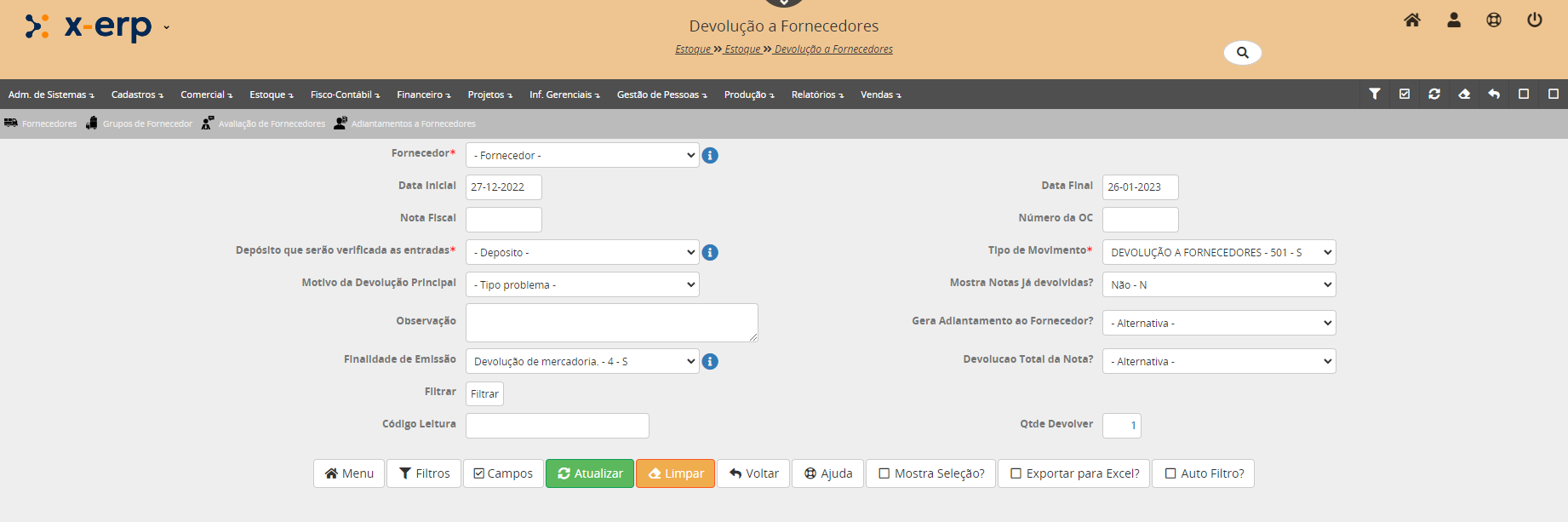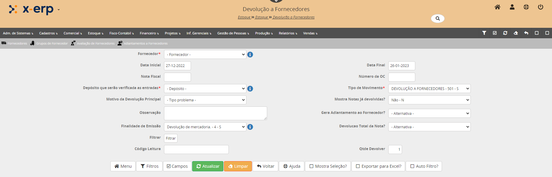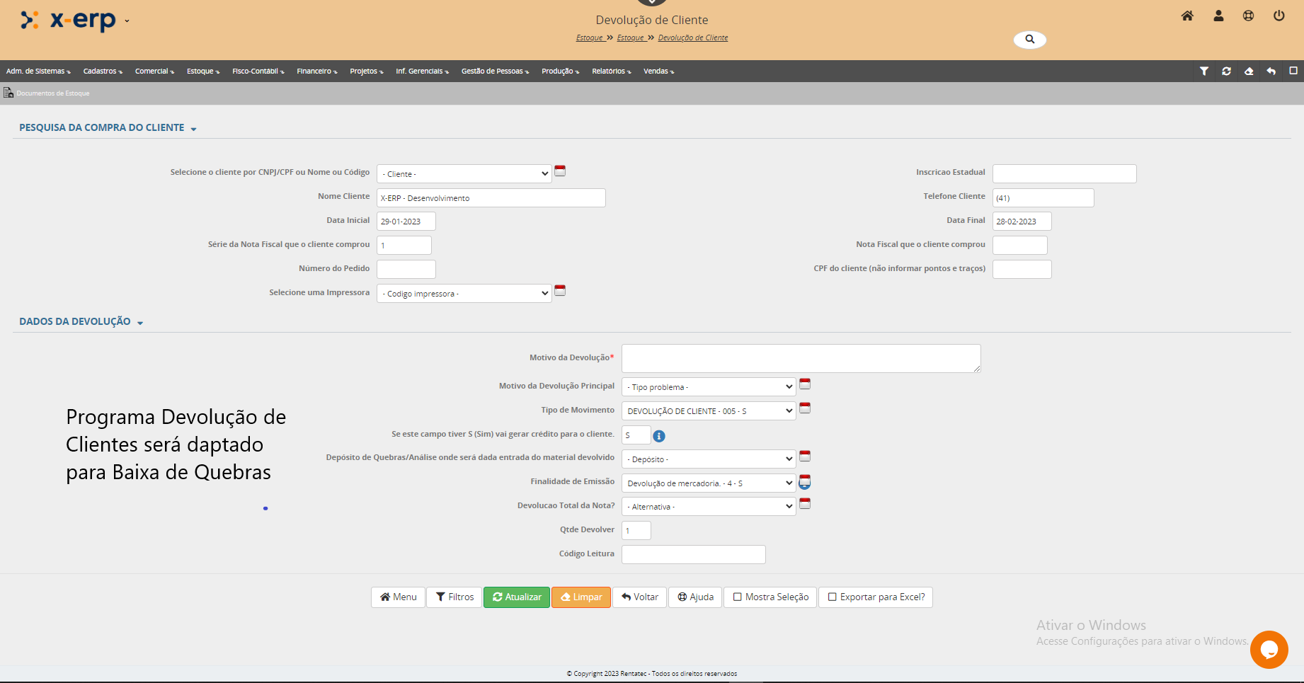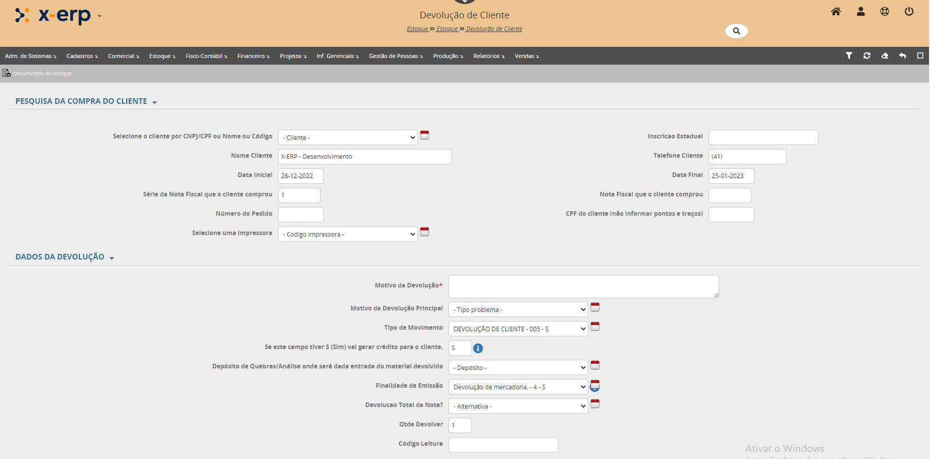 O programa Devolução de Cliente tem por objetivo dar entrada de mercadoria devolvida pelo cliente devido a quebras, defeito ou demais desacordos comerciais.