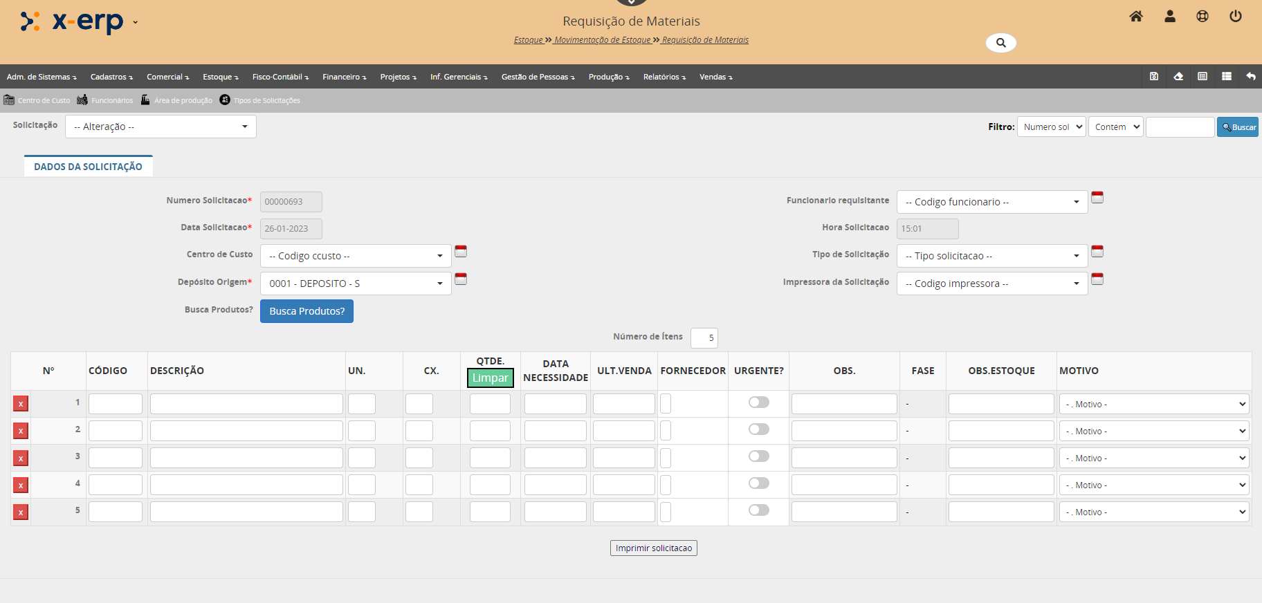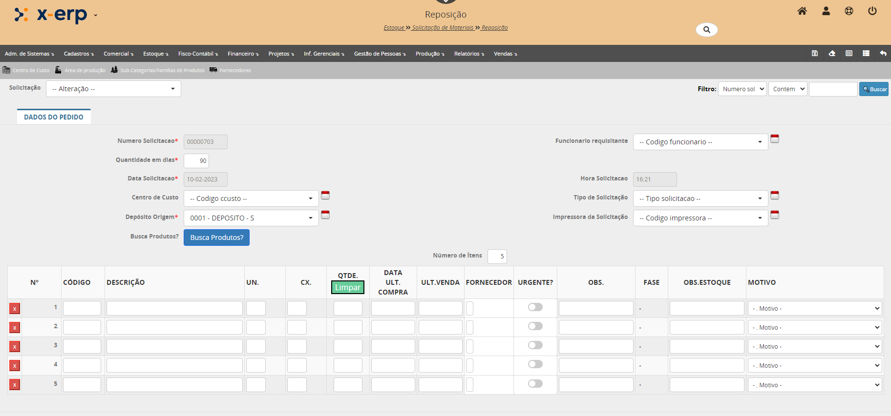 O programa Solicitações de Materiais (Reposição) tem por objetivo, cadastrar um solicitação de materiais para o estoque com a possibilidade de informar o Deposito de Origem e Deposito de destino.