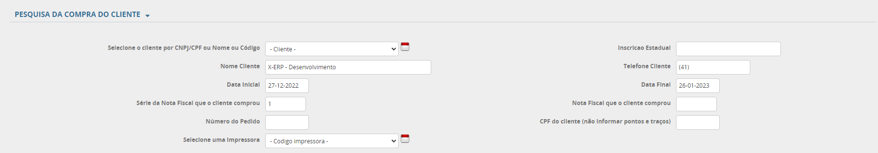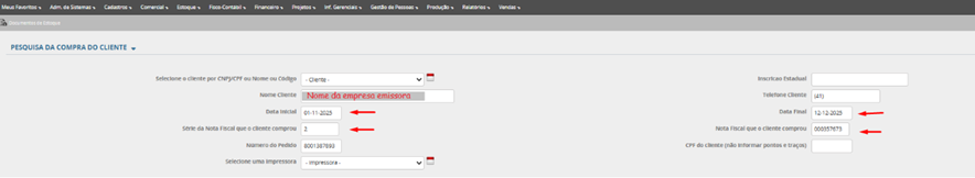 Com base no campo de Data inicial e Final o sistema irá listar as notas e pedidos emitidos para esse cliente. O usuário pode informar o numero da nota ou pedido que o cliente comprou para trazer uma informação mais precisa.