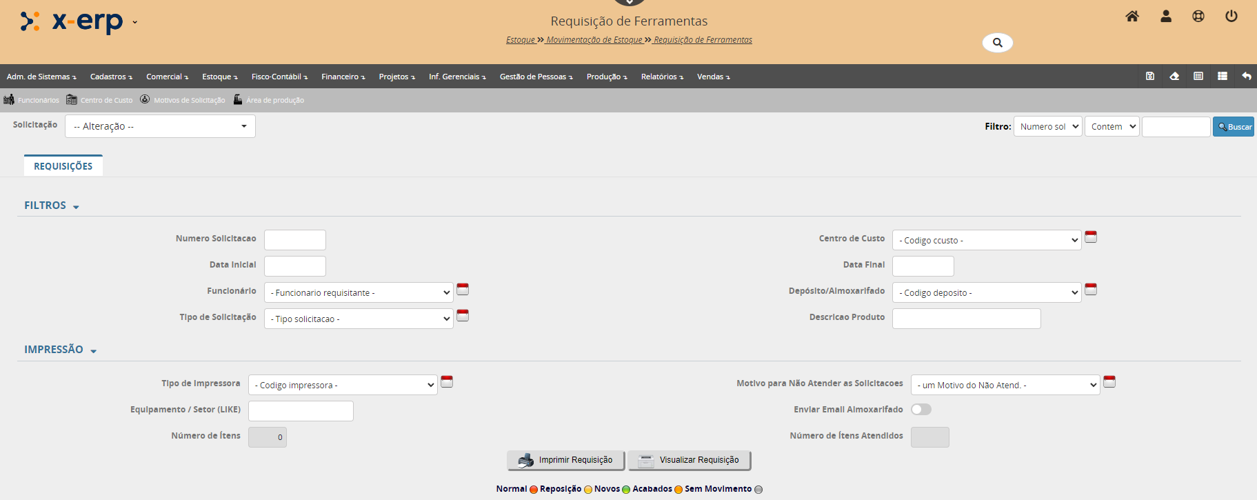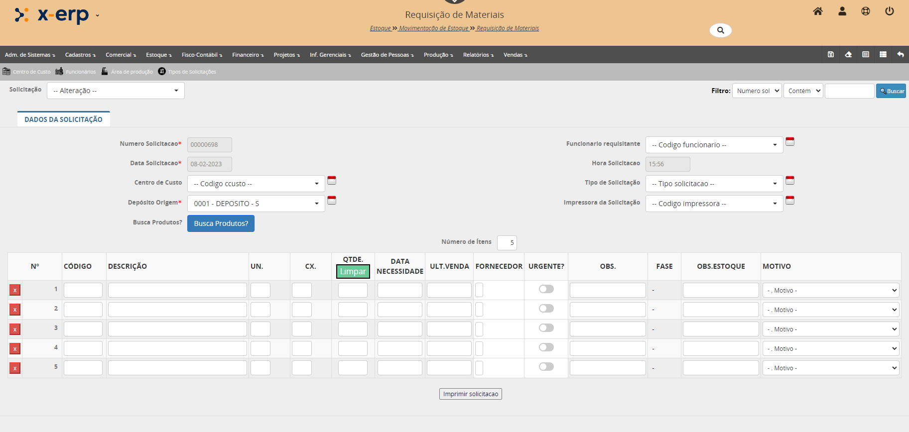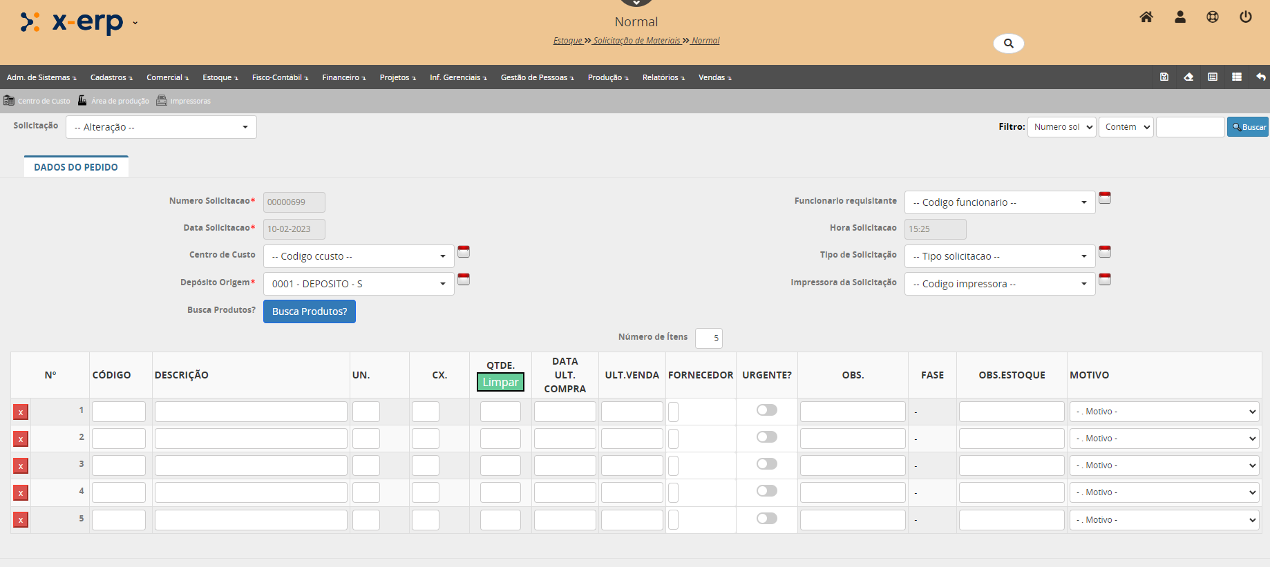 No menu principal, selecione: Estoque > Solicitação de Materiais > Normal