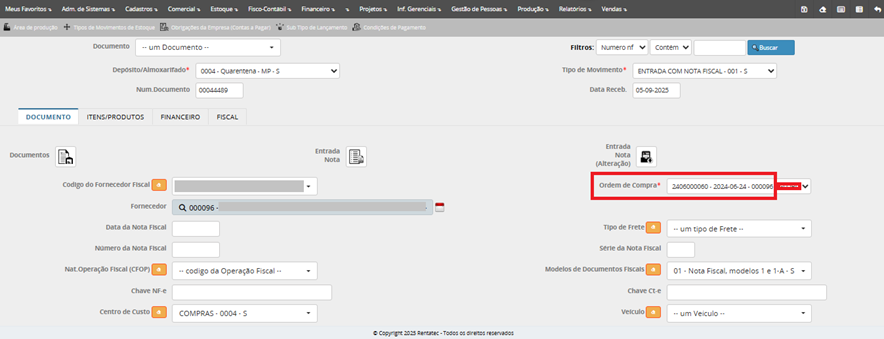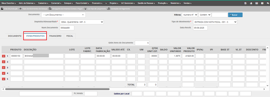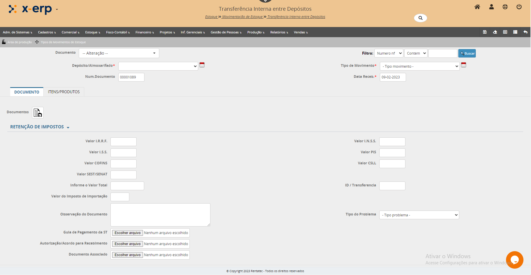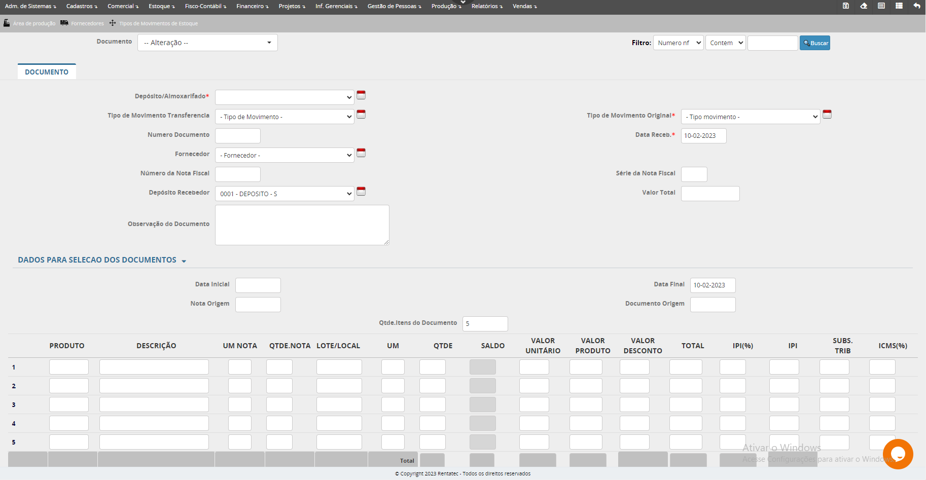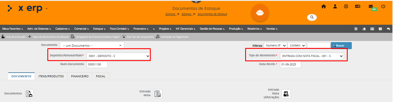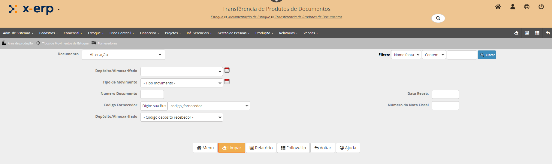 No menu principal, selecione: Estoque > Movimentação de Estoque > Transferência de Produtos de Documentos