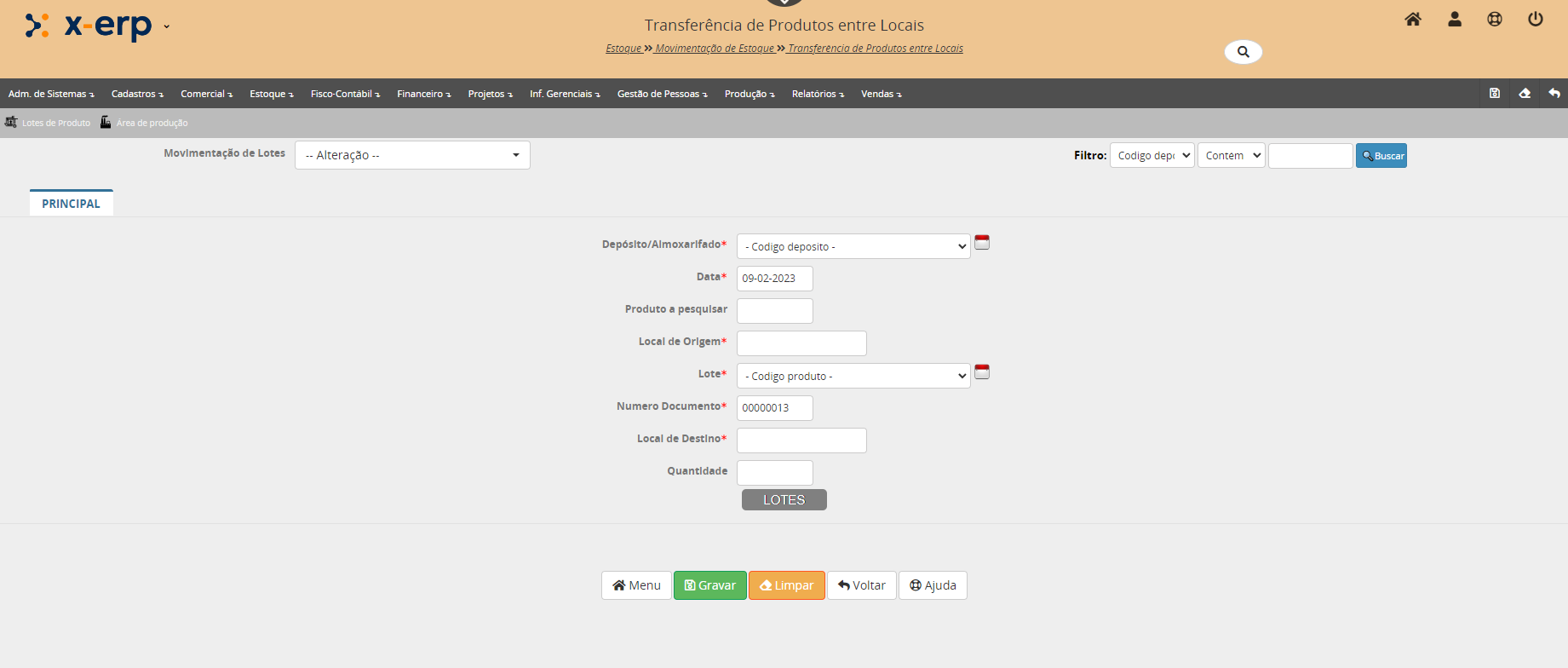 O programa Solicitações de Materiais (Sem Saldo no Período) tem por objetivo, cadastrar um solicitação de materiais para o estoque com a possibilidade de informar o Deposito de Origem e Deposito de destino.