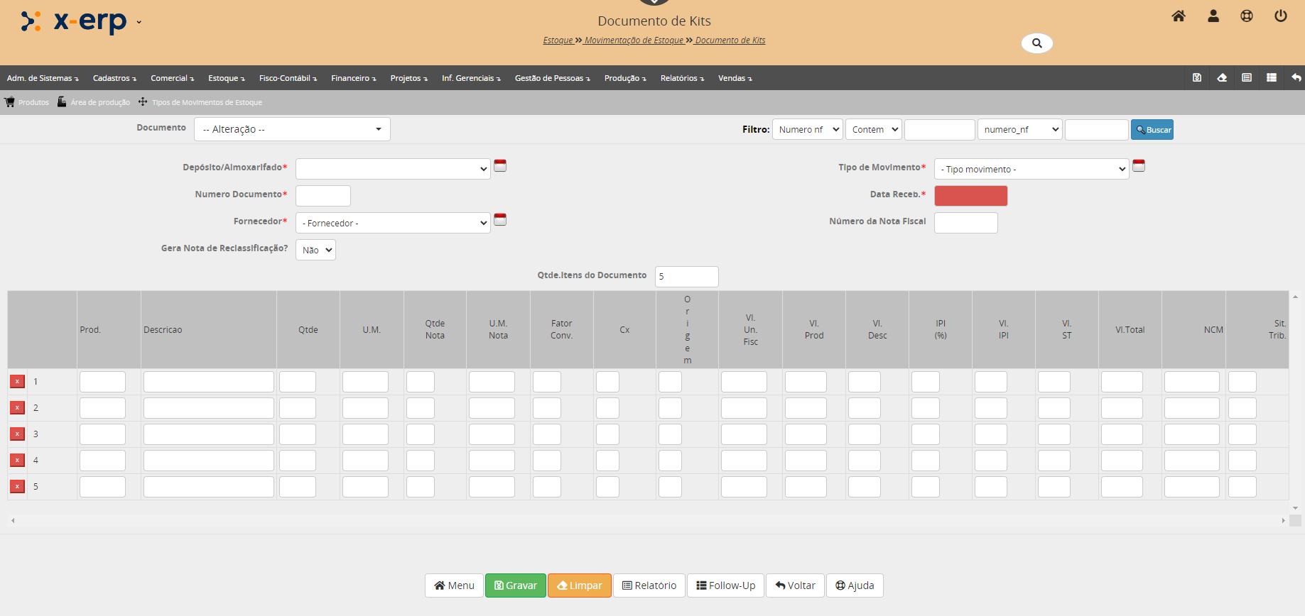 No menu principal, selecione: Estoque > Movimentação de Estoque > Documento de Kits