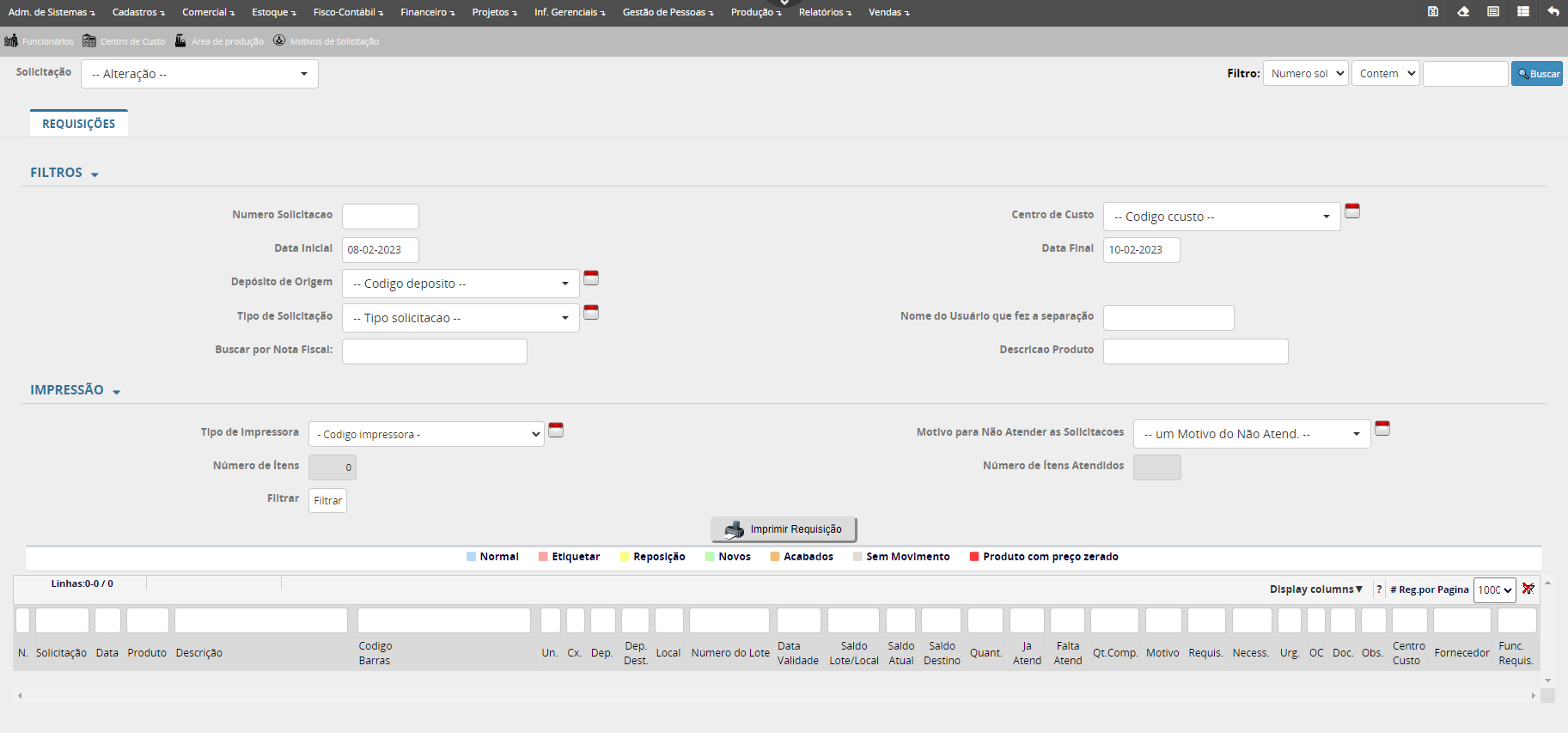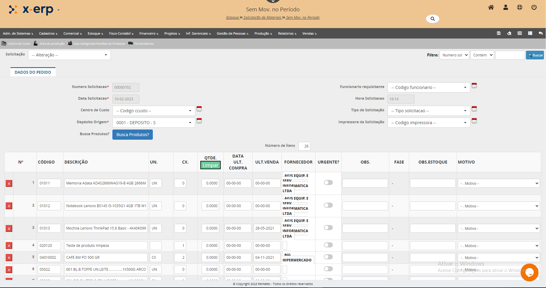 O programa Solicitações de Materiais (Sem movimentação no Período) tem por objetivo, mostrar todos os produtos onde não houve movimentação em um determinado período.. cadastrar um solicitação de materiais para o estoque com a possibilidade de informar o Deposito de Origem e Deposito de destino.