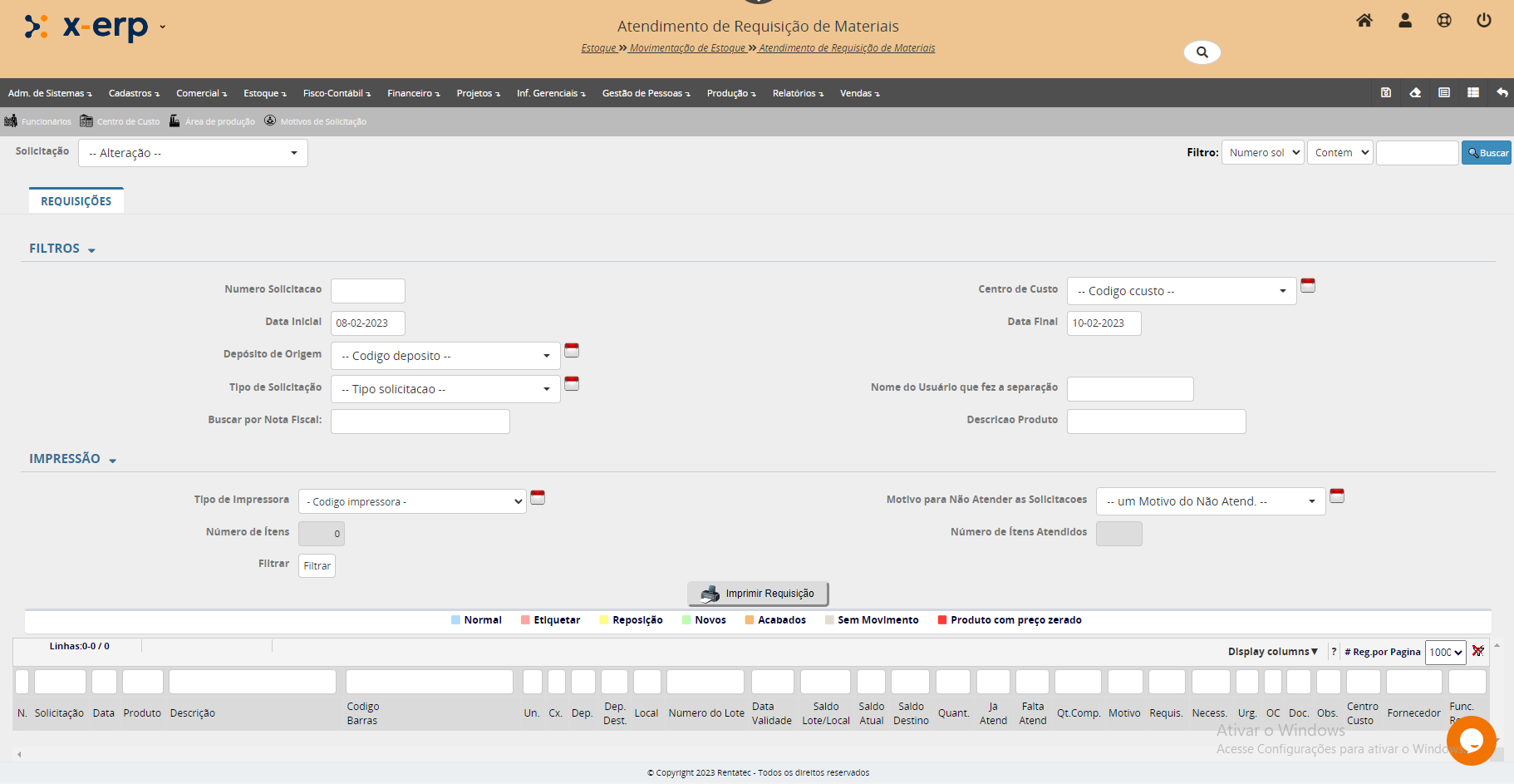 No menu principal, selecione: Estoque > Movimentação de Estoque > Atendimento de Requisição de Materiais