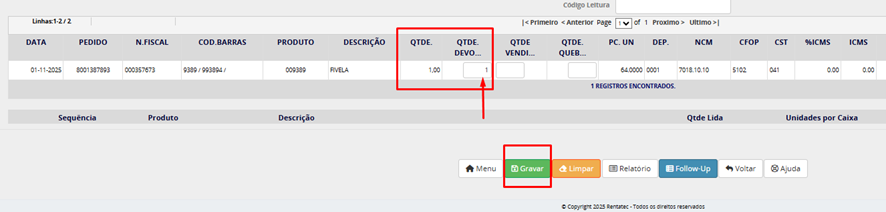 Depois informar uma quantidade correta, e a qual está sendo devolvida ao cliente. O mesmo deverá clicar em Gravar.