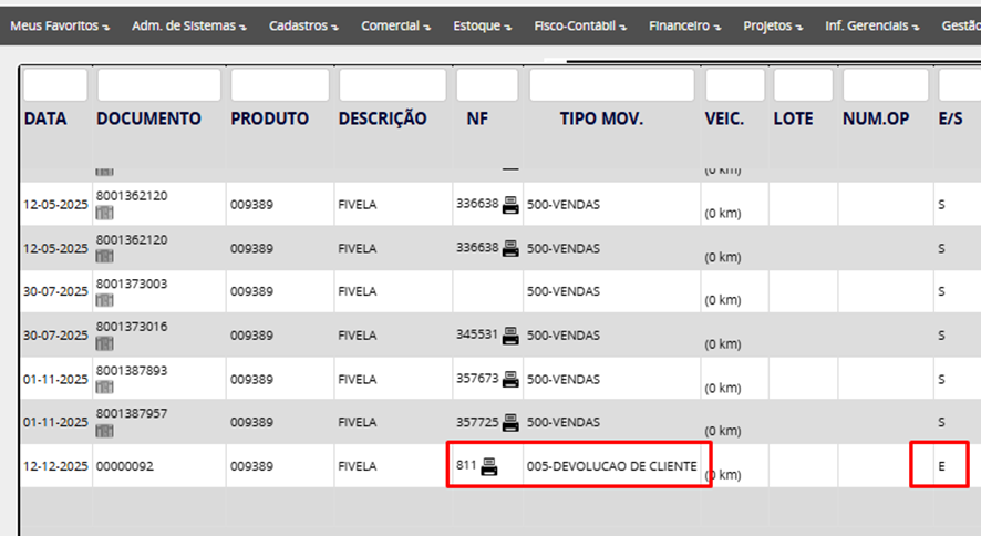 Dependendo dos dados informados pelo usuário sobre a venda e cliente, será mostrado na parte inferior do formulário as notas ou a nota específica com seus produtos para retorno.