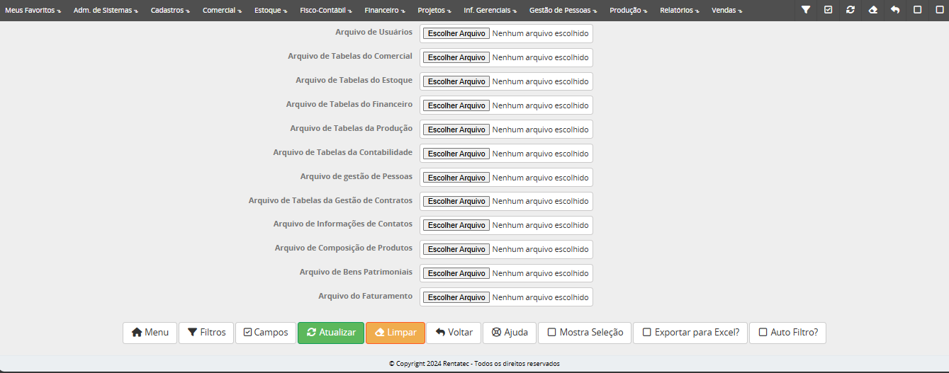 Identificar qual a planilha a ser importada, clicar em escolher arquivo para carregar o arquivo excel com os dados e clicar em atualizar.